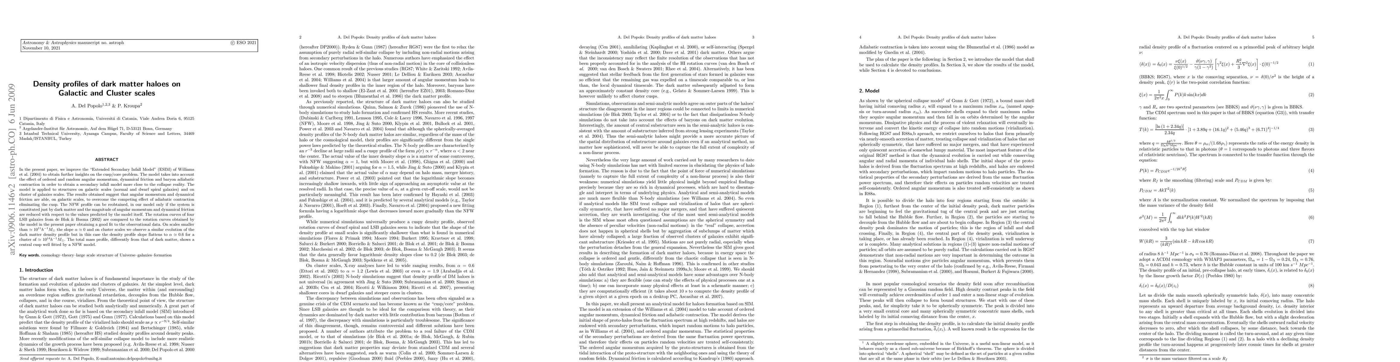 In the present paper, we improve the "Extended Secondary Infall Model" (ESIM) of Williams et al. (2004) to obtain further insights on the cusp/core problem. The model takes into account the effect of ordered and random angular momentum, dynamical friction and baryon adiabatic contraction in order to obtain a secondary infall model more close to the collapse reality. The model is applied to structures on galactic scales (normal and dwarf spiral galaxies) and on cluster of galaxies scales. The results obtained suggest that angular momentum and dynamical friction are able, on galactic scales, to overcome the competing effect of adiabatic contraction eliminating the cusp. The NFW profile can be reobtained, in our model only if the system is constituted just by dark matter and the magnitude of angular momentum and dynamical friction are reduced with respect to the values predicted by the model itself. The rotation curves of four LSB galaxies from de Blok & Bosma (2002) are compared to the rotation curves obtained by the model in the present paper obtaining a good fit to the observational data. On scales smaller than $\simeq 10^{11} h^{-1} M_{\odot}$ the slope $\alpha \simeq 0$ and on cluster scales we observe a similar evolution of the dark matter density profile but in this case the density profile slope flattens to $\alpha \simeq 0.6$ for a cluster of $\simeq 10^{14} h^{-1} M_{\odot}$. The total mass profile, differently from that of dark matter, shows a central cusp well fitted by a NFW model.