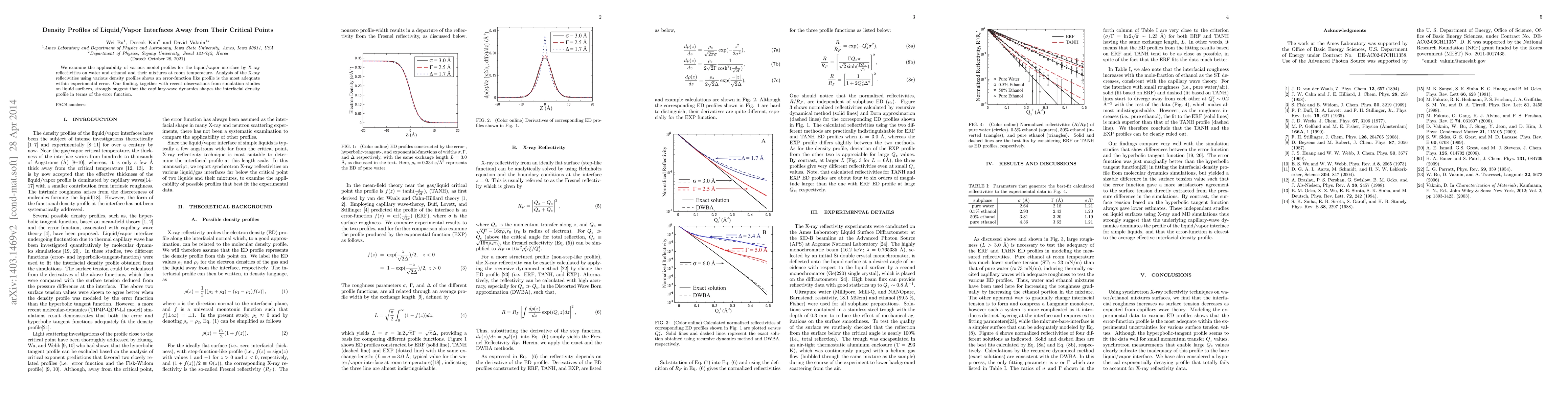 We examine the applicability of various model profiles for the liquid/vapor interface by X-ray reflectivities on water and ethanol and their mixtures at room temperature. Analysis of the X-ray reflecivities using various density profiles shows an error-function like profile is the most adequate within experimental error. Our finding, together with recent observations from simulation studies on liquid surfaces, strongly suggest that the capillary-wave dynamics shapes the interfacial density profile in terms of the error function.