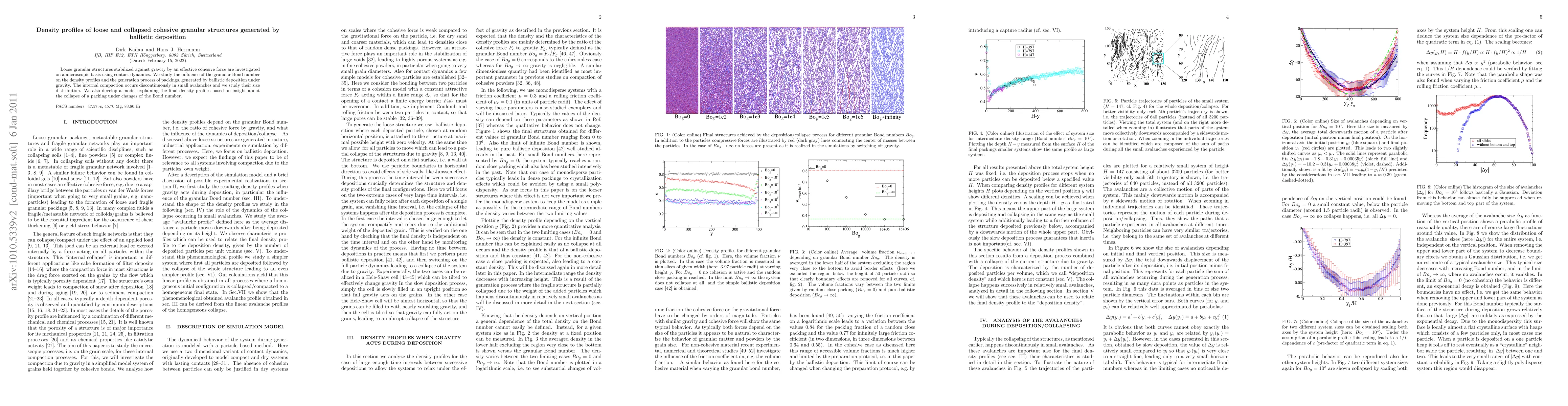 This paper investigates the density profiles of loose and collapsed granular structures formed through ballistic deposition, focusing on the impact of the granular Bond number. The study employs contact dynamics to analyze the internal compaction process and develops a model to explain the final density profiles based on the collapse dynamics under varying Bond number conditions.