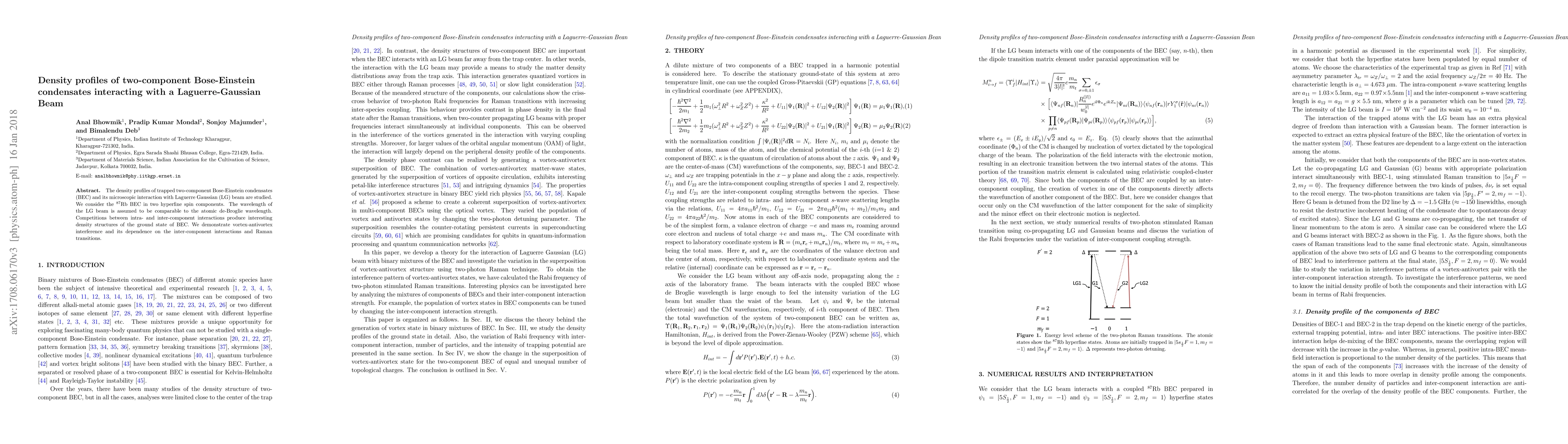 This paper investigates the density profiles of two-component Bose-Einstein condensates (BEC) interacting with a Laguerre-Gaussian beam, focusing on $^{87}$Rb BEC. It reveals complex density structures due to intra- and inter-component interactions, including vortex-antivortex interference influenced by Raman transitions and inter-component interactions.