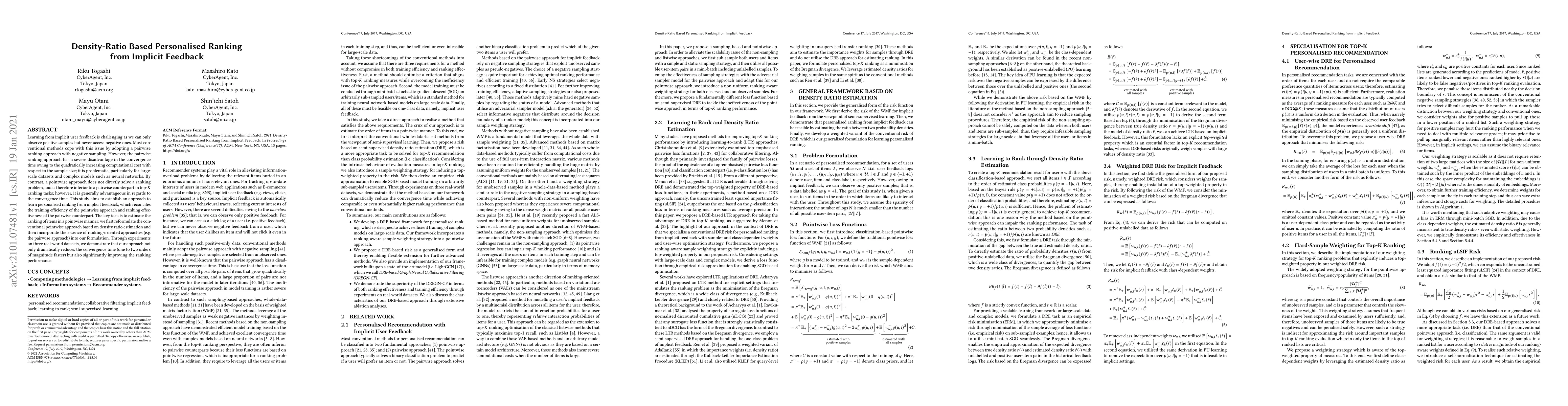 This paper proposes a density-ratio based approach to learn personalised ranking from implicit feedback, combining the efficiency of pointwise methods with the effectiveness of ranking-oriented approaches. The method significantly reduces convergence time while improving ranking performance on real-world datasets.
