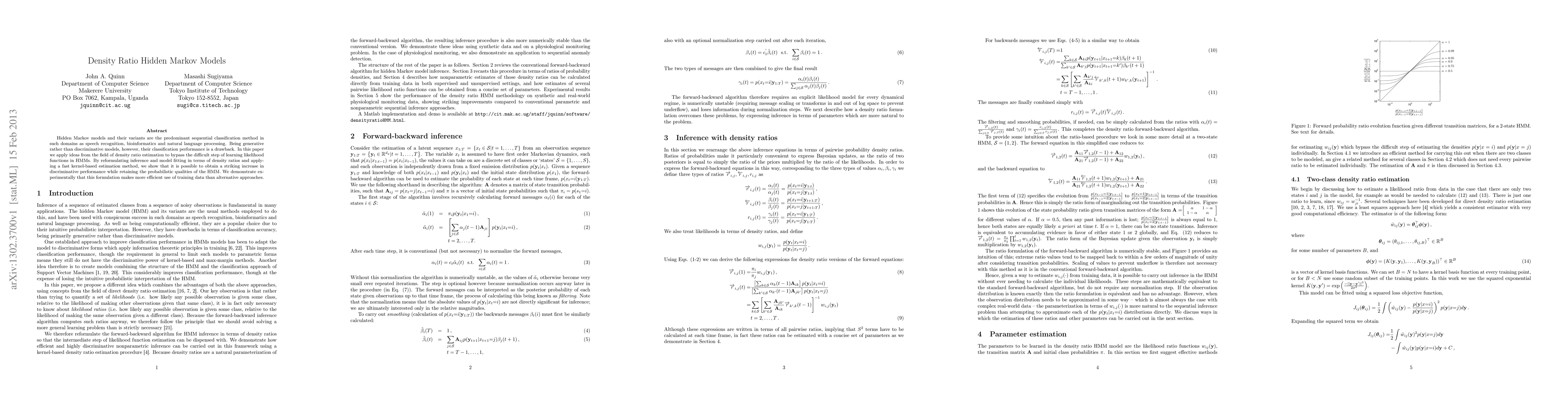 Hidden Markov models and their variants are the predominant sequential classification method in such domains as speech recognition, bioinformatics and natural language processing. Being generative rather than discriminative models, however, their classification performance is a drawback. In this paper we apply ideas from the field of density ratio estimation to bypass the difficult step of learning likelihood functions in HMMs. By reformulating inference and model fitting in terms of density ratios and applying a fast kernel-based estimation method, we show that it is possible to obtain a striking increase in discriminative performance while retaining the probabilistic qualities of the HMM. We demonstrate experimentally that this formulation makes more efficient use of training data than alternative approaches.