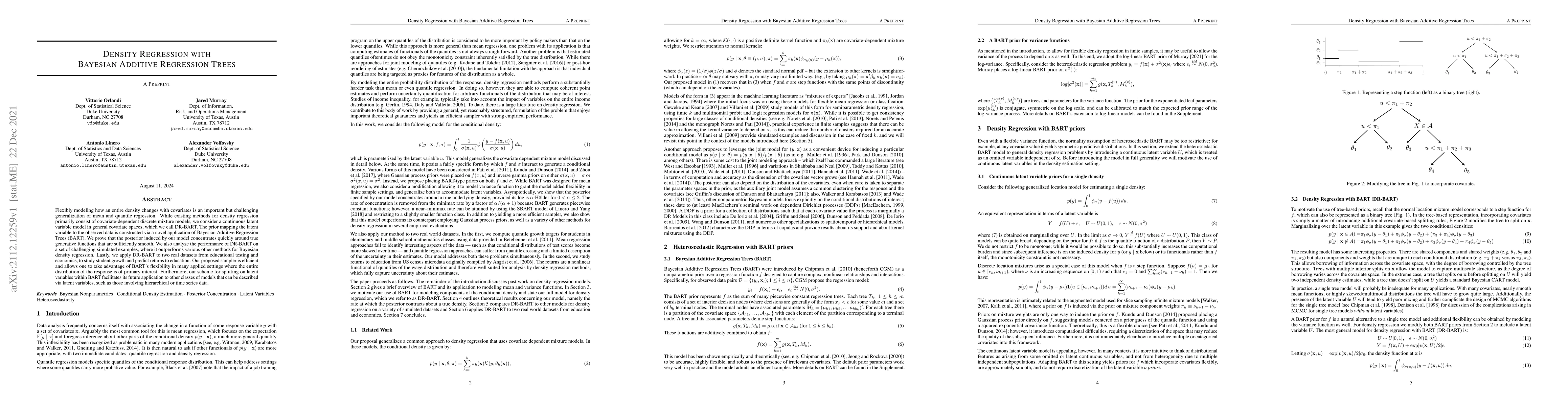 This paper proposes DR-BART, a Bayesian Additive Regression Trees model for density regression, which efficiently captures the entire distribution of responses over covariates. The method outperforms other density regression techniques on simulations and real datasets, and is flexible for various data types.