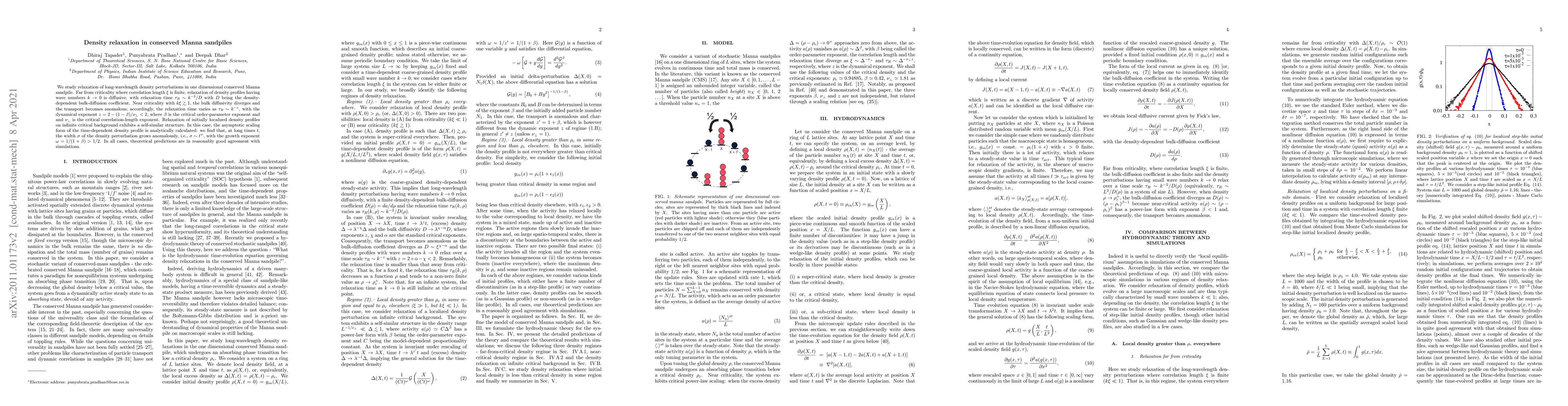 We study relaxation of long-wavelength density perturbations in one dimensional conserved Manna sandpile. Far from criticality where correlation length $\xi$ is finite, relaxation of density profiles having wave numbers $k \rightarrow 0$ is diffusive, with relaxation time $\tau_R \sim k^{-2}/D$ with $D$ being the density-dependent bulk-diffusion coefficient. Near criticality with $k \xi \gsim 1$, the bulk diffusivity diverges and the transport becomes anomalous; accordingly, the relaxation time varies as $\tau_R \sim k^{-z}$, with the dynamical exponent $z=2-(1-\beta)/\nu_{\perp} < 2$, where $\beta$ is the critical order-parameter exponent and and $\nu_{\perp}$ is the critical correlation-length exponent. Relaxation of initially localized density profiles on infinite critical background exhibits a self-similar structure. In this case, the asymptotic scaling form of the time-dependent density profile is analytically calculated: we find that, at long times $t$, the width $\sigma$ of the density perturbation grows anomalously, i.e., $\sigma \sim t^{w}$, with the growth exponent $\omega=1/(1+\beta) > 1/2$. In all cases, theoretical predictions are in reasonably good agreement with simulations.