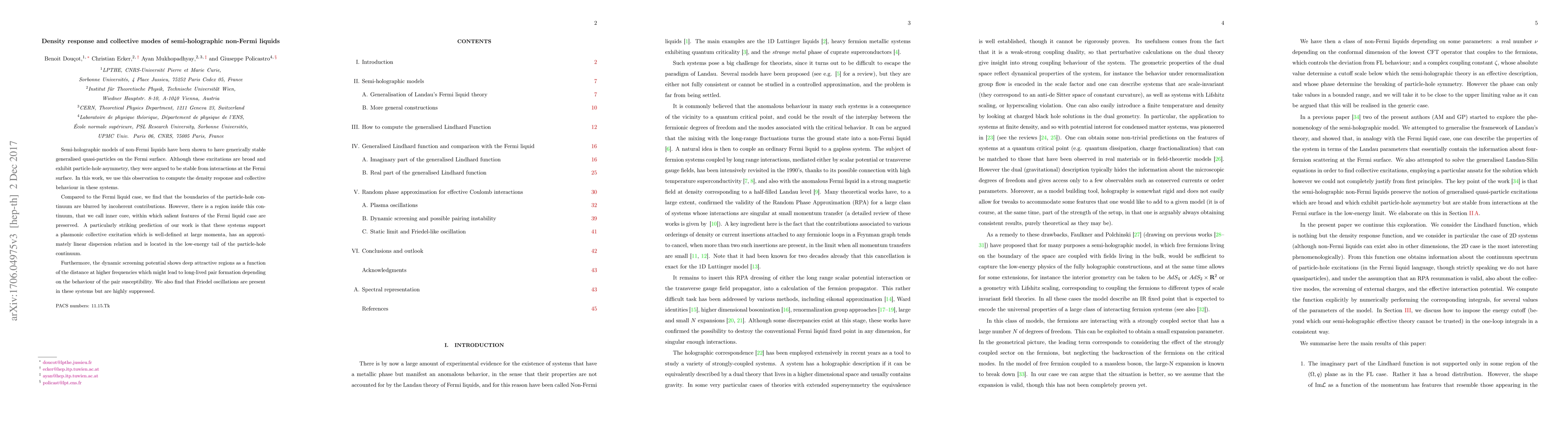 Semi-holographic models of non-Fermi liquids have been shown to have generically stable generalised quasi-particles on the Fermi surface. Although these excitations are broad and exhibit particle-hole asymmetry, they were argued to be stable from interactions at the Fermi surface. In this work, we use this observation to compute the density response and collective behaviour in these systems. Compared to the Fermi liquid case, we find that the boundaries of the particle-hole continuum are blurred by incoherent contributions. However, there is a region inside this continuum, that we call inner core, within which salient features of the Fermi liquid case are preserved. A particularly striking prediction of our work is that these systems support a plasmonic collective excitation which is well-defined at large momenta, has an approximately linear dispersion relation and is located in the low-energy tail of the particle-hole continuum. Furthermore, the dynamic screening potential shows deep attractive regions as a function of the distance at higher frequencies which might lead to long-lived pair formation depending on the behaviour of the pair susceptibility. We also find that Friedel oscillations are present in these systems but are highly suppressed.