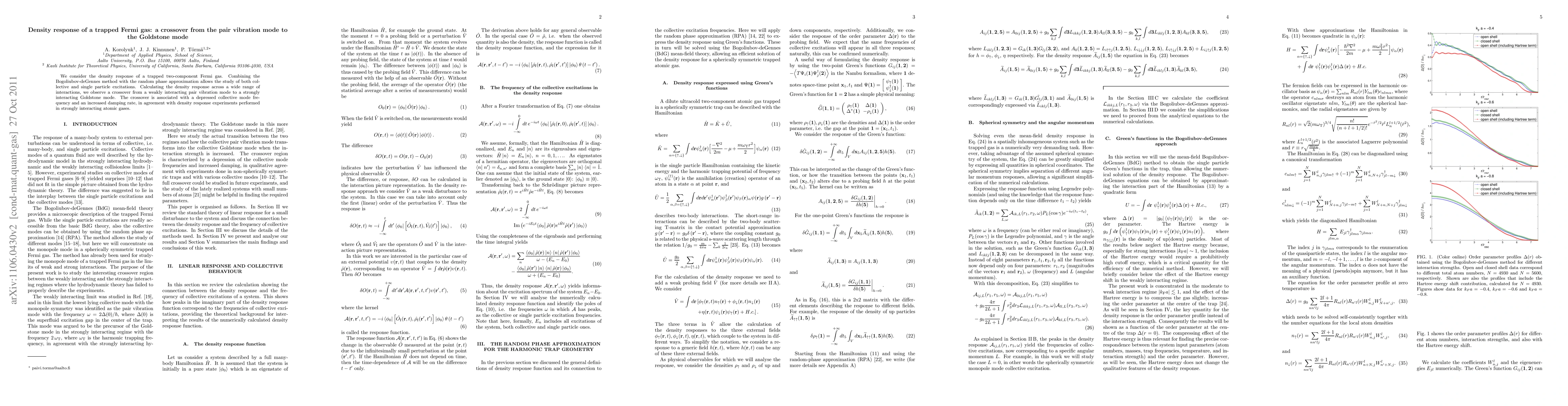 We consider the density response of a trapped two-component Fermi gas. Combining the Bogoliubov-deGennes method with the random phase approximation allows the study of both collective and single particle excitations. Calculating the density response across a wide range of interactions, we observe a crossover from a weakly interacting pair vibration mode to a strongly interacting Goldstone mode. The crossover is associated with a depressed collective mode frequency and an increased damping rate, in agreement with density response experiments performed in strongly interacting atomic gases.