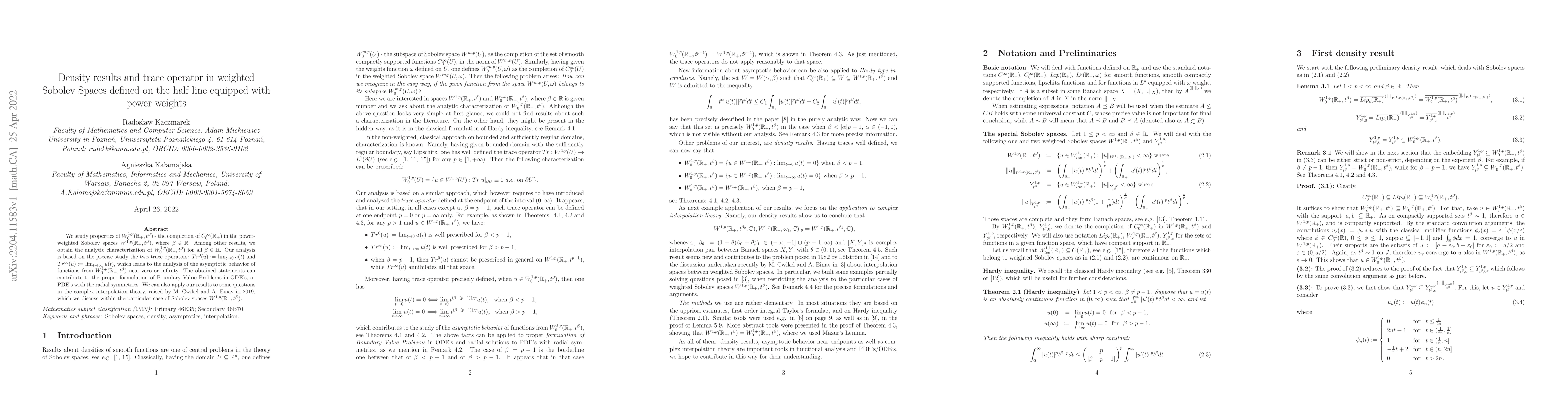 We study properties of $W_0^{1,p}(\mathbb{R}_+,t^\beta)$ - the completion of $C_0^\infty(\mathbb{R}_+)$ in the power-weighted Sobolev spaces $W^{1,p}(\mathbb{R}_+,t^\beta)$, where $\beta\in\mathbb{R}$. Among other results, we obtain the analytic characterization of $W_0^{1,p}(\mathbb{R}_+,t^\beta)$ for all $\beta\in \mathbb{R}$. Our analysis is based on the precise study the two trace operators: $Tr^{0}(u):= \lim_{t\to 0} u(t)$ and $Tr^{\infty}(u):= \lim_{t\to \infty} u(t)$, which leads to the analysis of the asymptotic behavior of functions from $W_0^{1,p}(\mathbb{R}_+,t^\beta)$ near zero or infinity. The obtained statements can contribute to the proper formulation of Boundary Value Problems in ODE's, or PDE's with the radial symmetries. We can also apply our results to some questions in the complex interpolation theory, raised by M. Cwikel and A. Einav in 2019, which we discuss within the particular case of Sobolev spaces $W^{1,p}(\mathbb{R}_+,t^\beta)$.