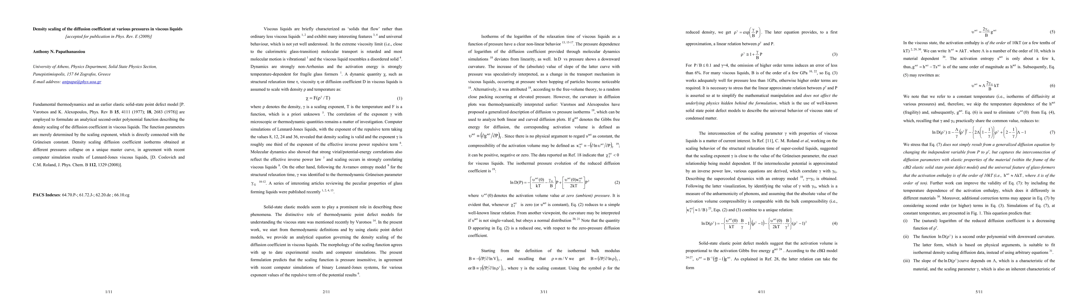 Fundamental thermodynamics and an earlier elastic solid-state point defect model [P. Varotsos and K. Alexopoulos, Phys. Rev B 15, 4111 (1977); 18, 2683 (1978)] are employed to formulate an analytical second-order polynomial function describing the density scaling of the diffusion coefficient in viscous liquids. The function parameters are merely determined by the scaling exponent, which is directly connected with the Gruneisen constant. Density scaling diffusion coefficient isotherms obtained at different pressures collapse on a unique master curve, in agreement with recent computer simulation results of Lennard-Jones viscous liquids, [D. Coslovich and C.M. Roland, J. Phys. Chem. B 112, 1329 (2008)].