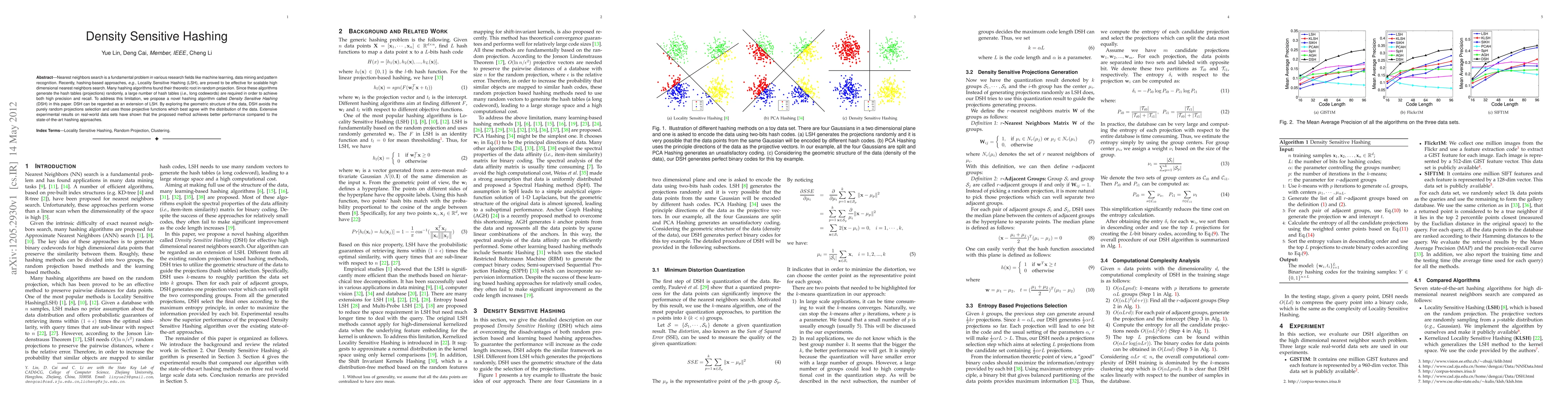 The paper proposes Density Sensitive Hashing (DSH), an extension of Locality Sensitive Hashing (LSH) that leverages the geometric structure of data to select projective functions that align with the data distribution, achieving better performance in nearest neighbors search compared to existing methods. Experimental results on real-world datasets demonstrate DSH's superior precision and recall efficiency.