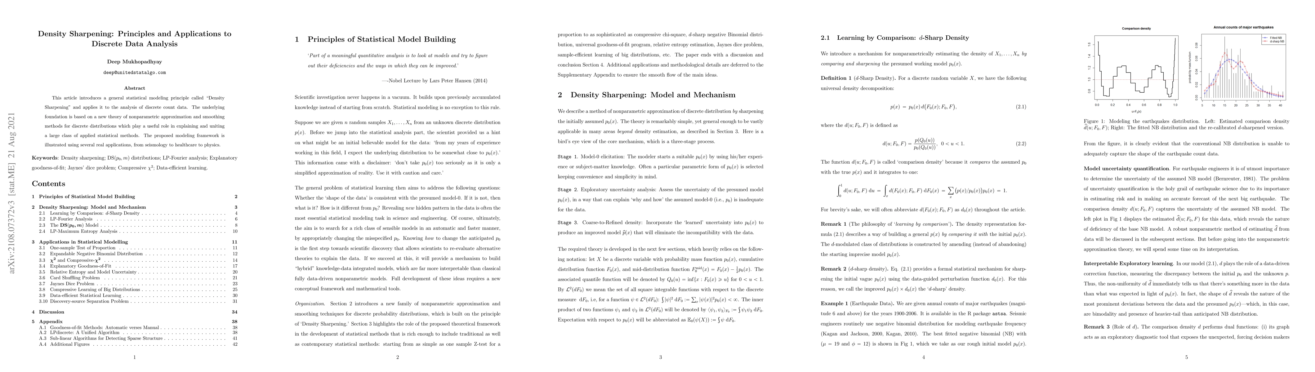 This paper introduces "Density Sharpening," a statistical modeling principle for nonparametric approximation and smoothing of discrete distributions, and applies it to various real-world applications, including seismology, healthcare, and physics. The method aims to unify and explain a broad class of applied statistical techniques.