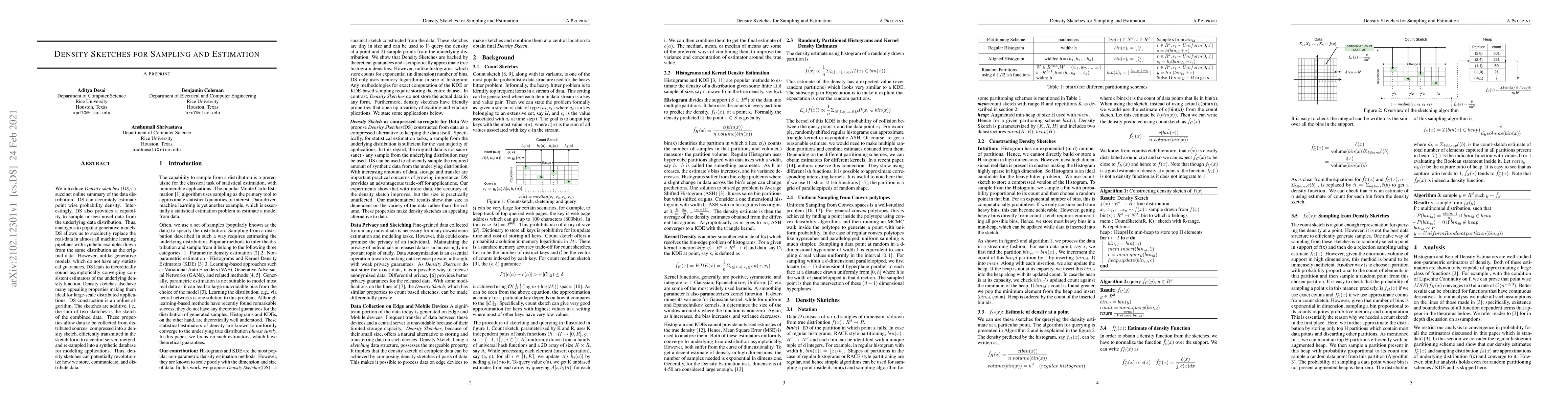 We introduce Density sketches (DS): a succinct online summary of the data distribution. DS can accurately estimate point wise probability density. Interestingly, DS also provides a capability to sample unseen novel data from the underlying data distribution. Thus, analogous to popular generative models, DS allows us to succinctly replace the real-data in almost all machine learning pipelines with synthetic examples drawn from the same distribution as the original data. However, unlike generative models, which do not have any statistical guarantees, DS leads to theoretically sound asymptotically converging consistent estimators of the underlying density function. Density sketches also have many appealing properties making them ideal for large-scale distributed applications. DS construction is an online algorithm. The sketches are additive, i.e., the sum of two sketches is the sketch of the combined data. These properties allow data to be collected from distributed sources, compressed into a density sketch, efficiently transmitted in the sketch form to a central server, merged, and re-sampled into a synthetic database for modeling applications. Thus, density sketches can potentially revolutionize how we store, communicate, and distribute data.