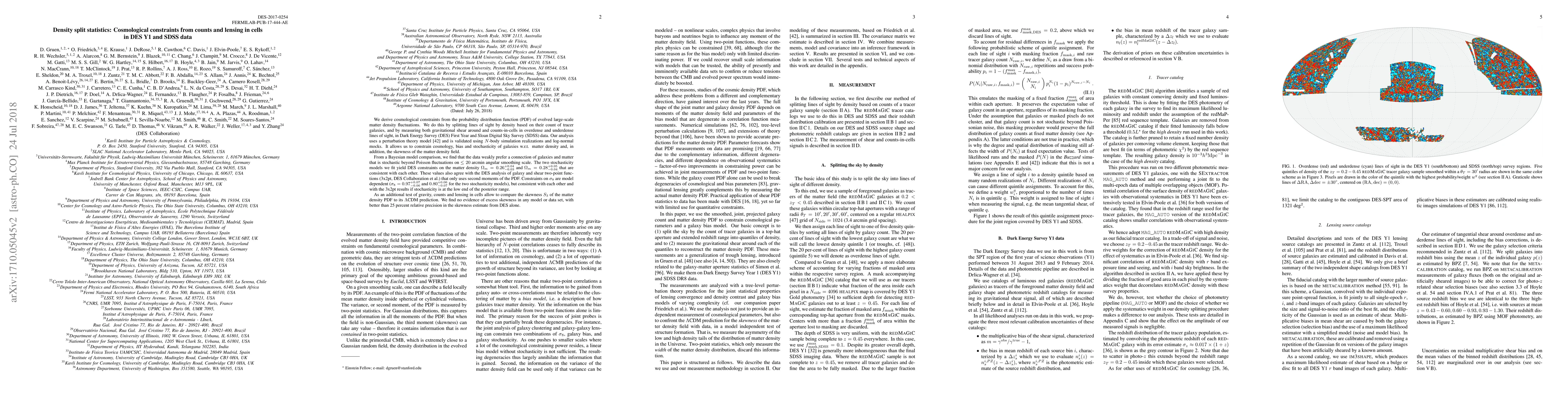 We derive cosmological constraints from the probability distribution function (PDF) of evolved large-scale matter density fluctuations. We do this by splitting lines of sight by density based on their count of tracer galaxies, and by measuring both gravitational shear around and counts-in-cells in overdense and underdense lines of sight, in Dark Energy Survey (DES) First Year and Sloan Digital Sky Survey (SDSS) data. Our analysis uses a perturbation theory model (see companion paper Friedrich at al.) and is validated using N-body simulation realizations and log-normal mocks. It allows us to constrain cosmology, bias and stochasticity of galaxies w.r.t. matter density and, in addition, the skewness of the matter density field. From a Bayesian model comparison, we find that the data weakly prefer a connection of galaxies and matter that is stochastic beyond Poisson fluctuations on <=20 arcmin angular smoothing scale. The two stochasticity models we fit yield DES constraints on the matter density $\Omega_m=0.26^{+0.04}_{-0.03}$ and $\Omega_m=0.28^{+0.05}_{-0.04}$ that are consistent with each other. These values also agree with the DES analysis of galaxy and shear two-point functions (3x2pt) that only uses second moments of the PDF. Constraints on $\sigma_8$ are model dependent ($\sigma_8=0.97^{+0.07}_{-0.06}$ and $0.80^{+0.06}_{-0.07}$ for the two stochasticity models), but consistent with each other and with the 3x2pt results if stochasticity is at the low end of the posterior range. As an additional test of gravity, counts and lensing in cells allow to compare the skewness $S_3$ of the matter density PDF to its LCDM prediction. We find no evidence of excess skewness in any model or data set, with better than 25 per cent relative precision in the skewness estimate from DES alone.