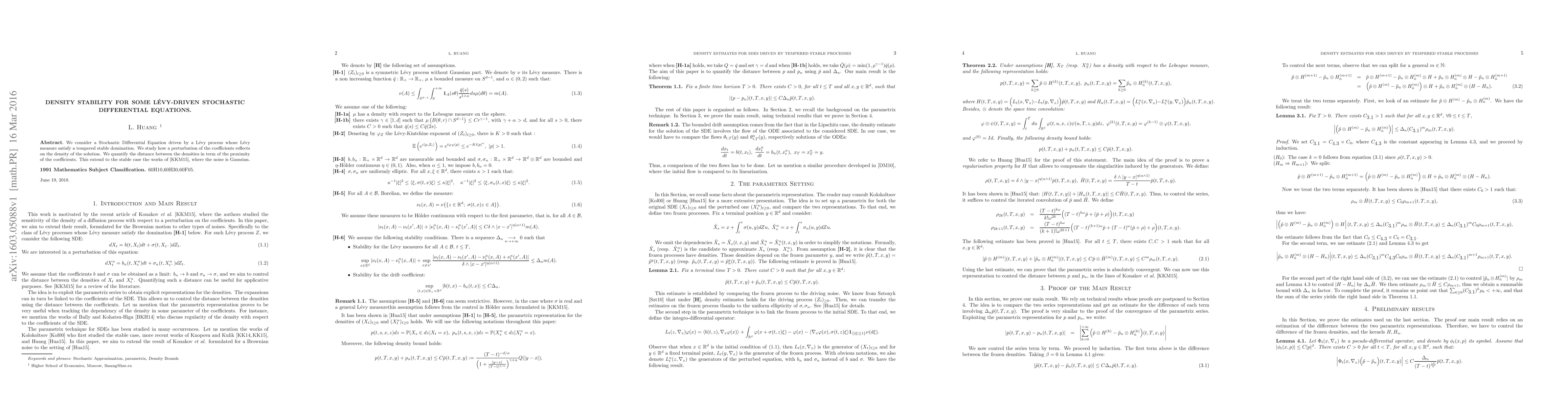 We consider a Stochastic Differential Equation driven by a L\'evy process whose L\'evy measure satisfy a tempered stable domination. We study how a perturbation of the coefficients reflects on the density of the solution. We quantify the distance between the densities in term of the proximity of the coefficients. This extend to the stable case the works of [KKM15], where the noise is Gaussian.