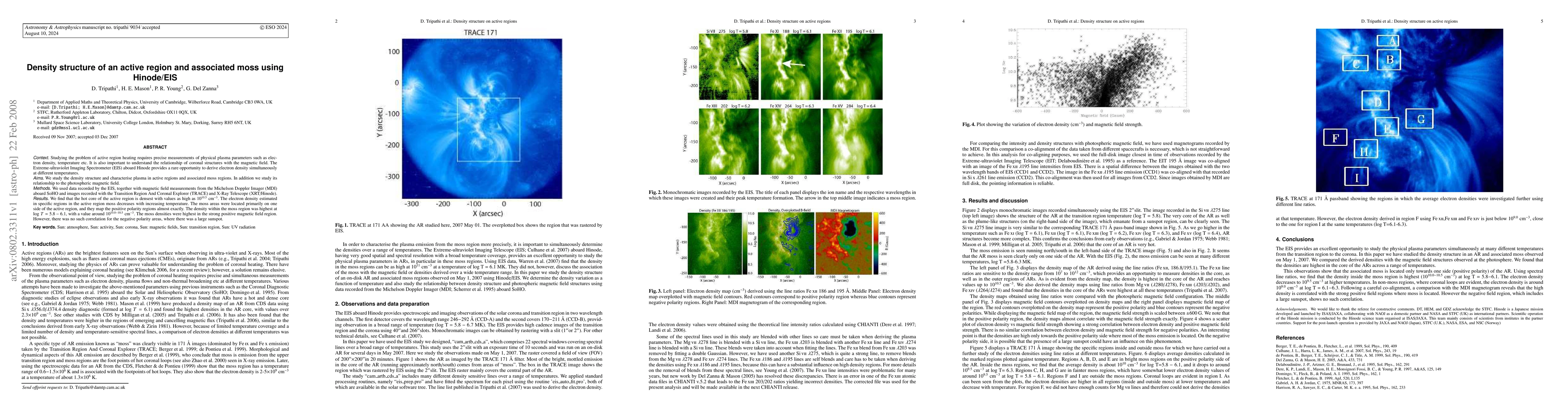 Context: Studying the problem of active region heating requires precise measurements of physical plasma parameters such as electron density, temperature etc. It is also important to understand the relationship of coronal structures with the magnetic field. The Extreme-ultraviolet Imaging Spectrometer (EIS) aboard Hinode provides a rare opportunity to derive electron density simultaneously at different temperatures. Aims: MethodsWe study the density structure and characterise plasma in active regions and associated moss regions. In addition we study its relationship to the photospheric magnetic field. Methods: We used data recorded by the EIS, together with magnetic field measurements from the Michelson Doppler Imager (MDI) aboard SoHO and images recorded with the Transition Region And Coronal Explorer (TRACE) and X-Ray Telescope (XRT/Hinode). Results: We find that the hot core of the active region is densest with values as high as 10^10.5 cm^-3. The electron density estimated in specific regions in the active region moss decreases with increasing temperature. The moss areas were located primarily on one side of the active region, and they map the positive polarity regions almost exactly. The density within the moss region was highest at log T=5.8-6.1, with a value around 10^(10.0-10.5) cm^-3. The moss densities were highest in the strong positive magnetic field region. However, there was no such correlation for the negative polarity areas, where there was a large sunspot.