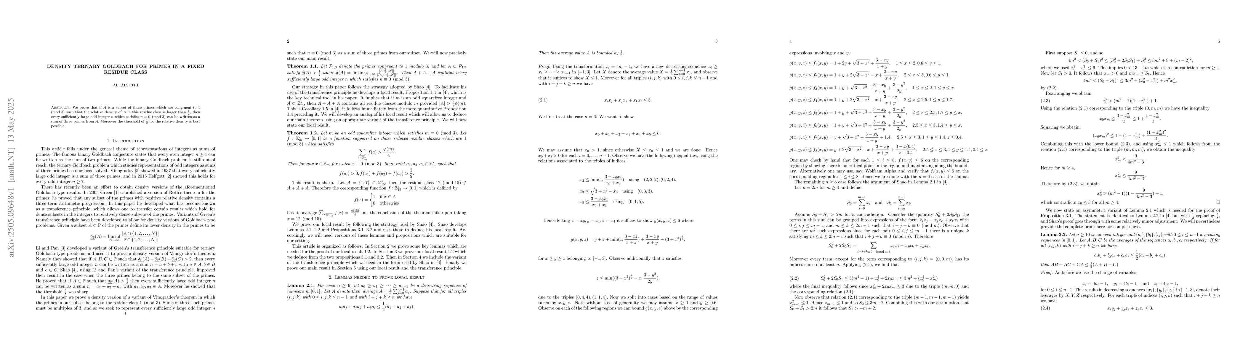 We prove that if $A$ is a subset of those primes which are congruent to $1 \pmod{3}$ such that the relative density of $A$ in this residue class is larger than $\frac{1}{2},$ then every sufficiently large odd integer $n$ which satisfies $n \equiv 0 \pmod{3}$ can be written as a sum of three primes from $A.$ Moreover the threshold of $\frac{1}{2}$ for the relative density is best possible.