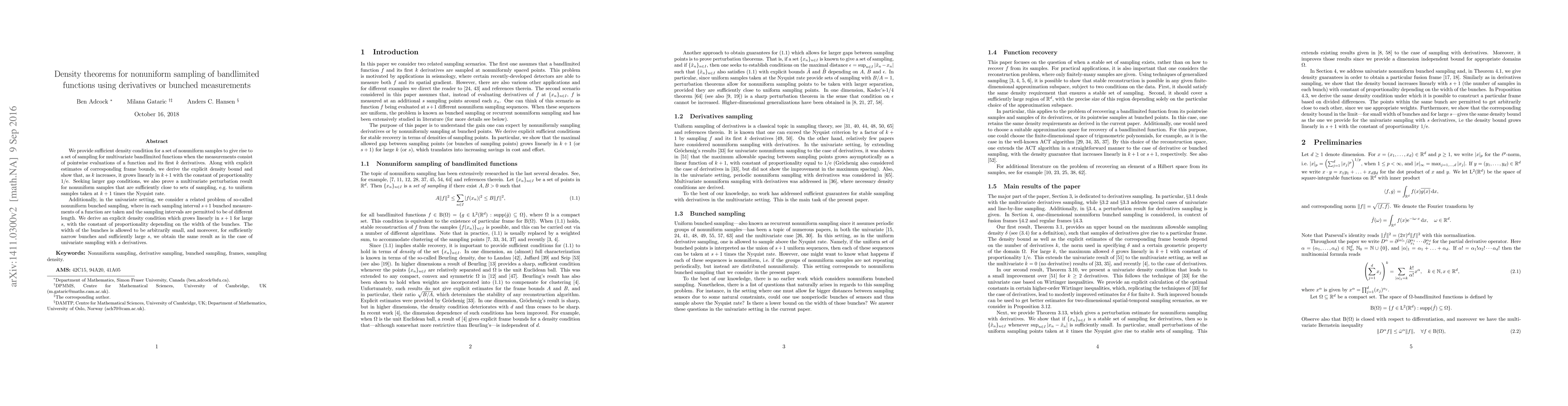 This paper provides sufficient density conditions for nonuniform sampling of multivariate bandlimited functions using pointwise evaluations of a function and its derivatives, showing that density grows linearly with the number of derivatives. It also explores multivariate perturbation results and addresses nonuniform bunched sampling in the univariate setting, deriving a density condition that scales linearly with the number of bunched measurements.
