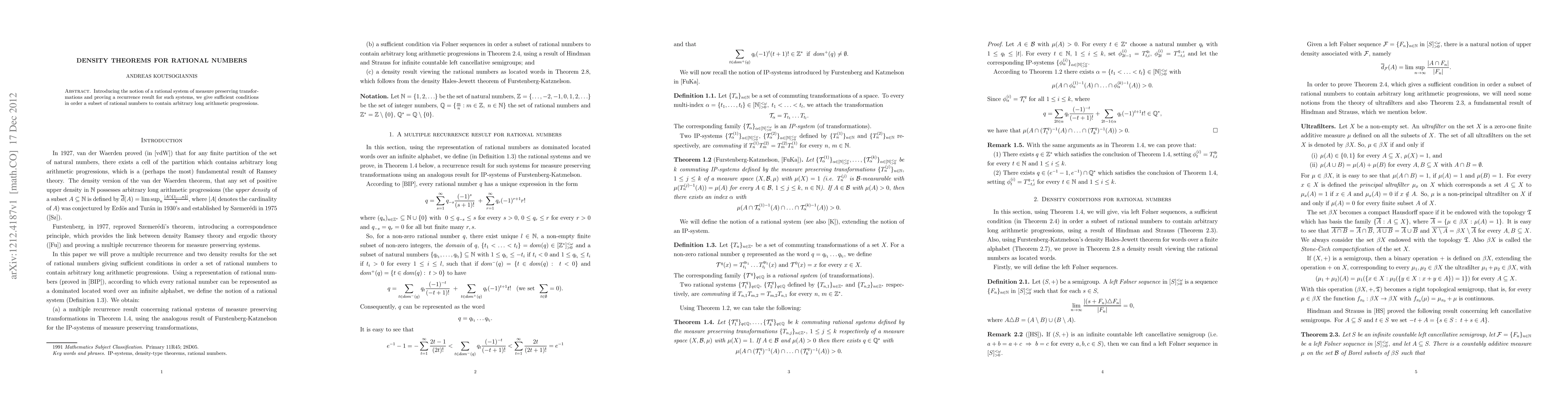 Introducing the notion of a rational system of measure preserving transformations and proving a recurrence result for such systems, we give sufficient conditions in order a subset of rational numbers to contain arbitrary long arithmetic progressions.