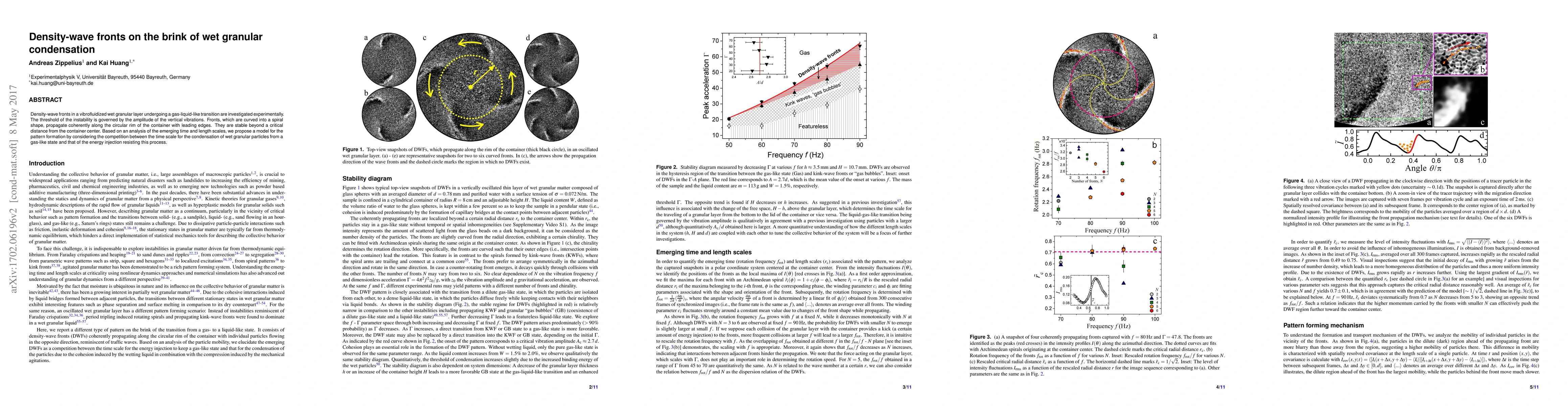 This study investigates density-wave fronts in a vibrofluidized wet granular layer, finding spiral-shaped fronts that propagate coherently along the container's rim and remain stable beyond a critical distance from the center. The model proposes that pattern formation results from the competition between particle condensation and energy injection due to vertical vibrations.