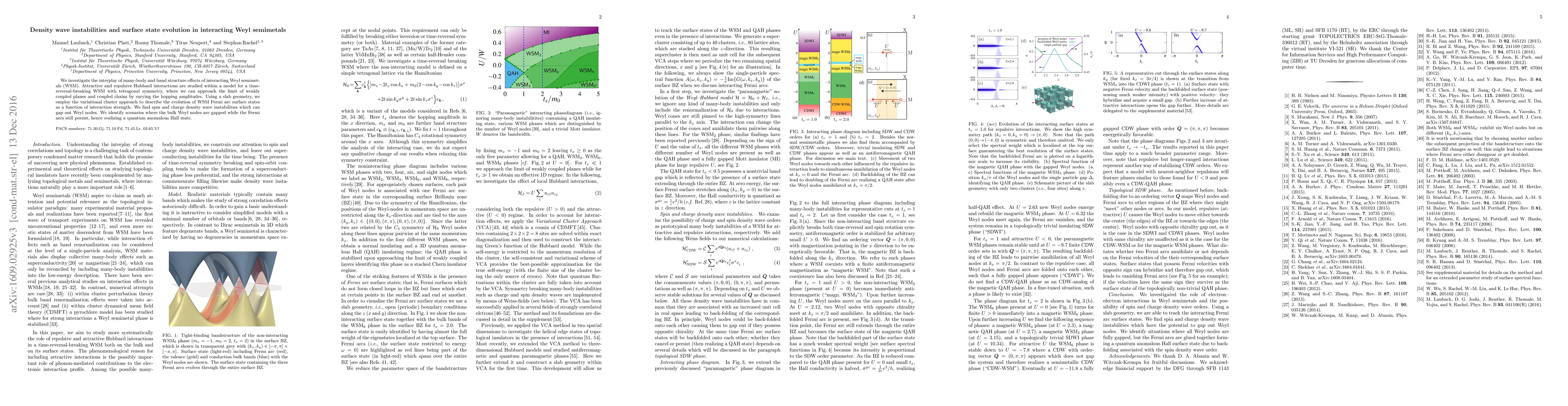 We investigate the interplay of many-body and band structure effects of interacting Weyl semimetals (WSM). Attractive and repulsive Hubbard interactions are studied within a model for a time-reversal-breaking WSM with tetragonal symmetry, where we can approach the limit of weakly coupled planes and coupled chains by varying the hopping amplitudes. Using a slab geometry, we employ the variational cluster approach to describe the evolution of WSM Fermi arc surface states as a function of interaction strength. We find spin and charge density wave instabilities which can gap out Weyl nodes. We identify scenarios where the bulk Weyl nodes are gapped while the Fermi arcs still persist, hence realizing a quantum anomalous Hall state.