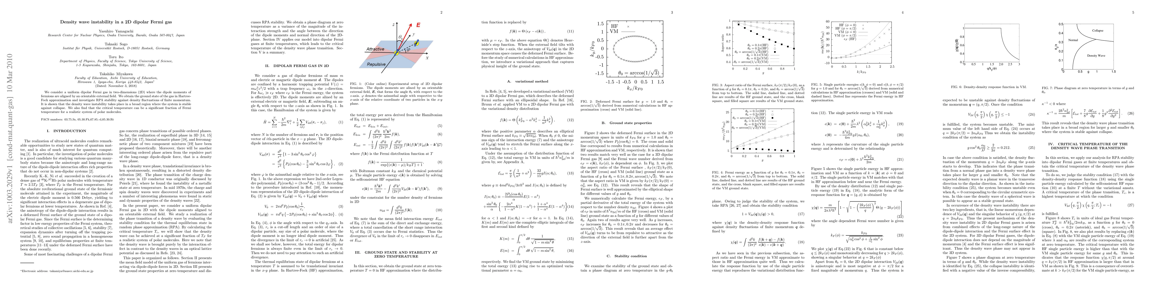 Summary: This study investigates the density wave instability in a 2D dipolar Fermi gas under an external field, revealing stability against collapse and identifying a significant critical temperature fraction of the Fermi temperature, indicating potential for practical applications in polar molecules.