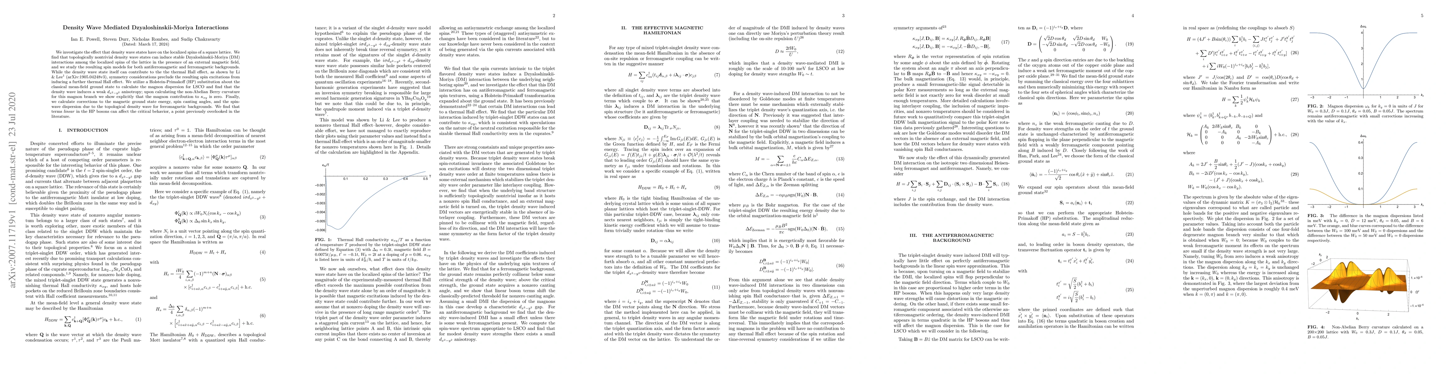 We investigate the effect that density wave states have on the localized spins of a square lattice. We find that topologically nontrivial density wave states can induce stable Dzyaloshinskii-Moriya (DM) interactions among the localized spins of the lattice in the presence of an external magnetic field, and we study the resulting spin models for both antiferromagnetic and ferromagnetic backgrounds. While the density wave state itself can contribute to the the thermal Hall effect, as shown by Li & Lee (arXiv:1905.04248v3), symmetry considerations preclude the resulting spin excitations from inducing a further thermal Hall effect. We utilize a Holstein-Primakoff (HP) substitution about the classical mean-field ground state to calculate the magnon dispersion for LSCO and find that the density wave induces a weak $d_{x^2-y^2}$ anisotropy; upon calculating the non-Abelian Berry curvature for this magnon branch we show explicitly that the magnon contribution to $\kappa_{xy}$ is zero. Finally, we calculate corrections to the magnetic ground state energy, spin canting angles, and the spin-wave dispersion due to the topological density wave for ferromagnetic backgrounds. We find that terms linear in the HP bosons can affect the critical behavior, a point previously overlooked in the literature.