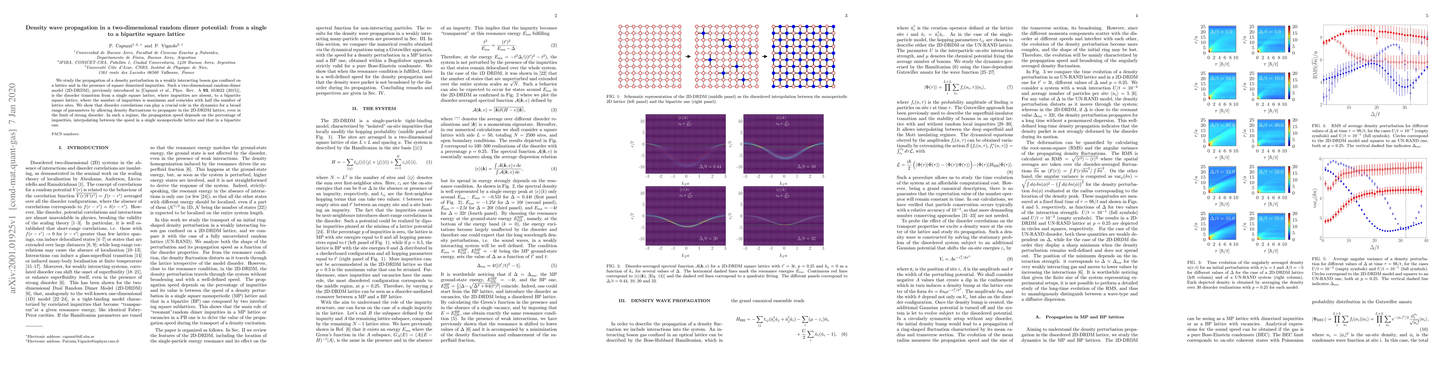 This paper investigates the propagation of density perturbations in a weakly interacting boson gas on a two-dimensional random dimer lattice, transitioning from a single square lattice to a bipartite one. It demonstrates that disorder correlations enable density fluctuations to propagate even under strong disorder, with propagation speed varying with the impurity percentage.
