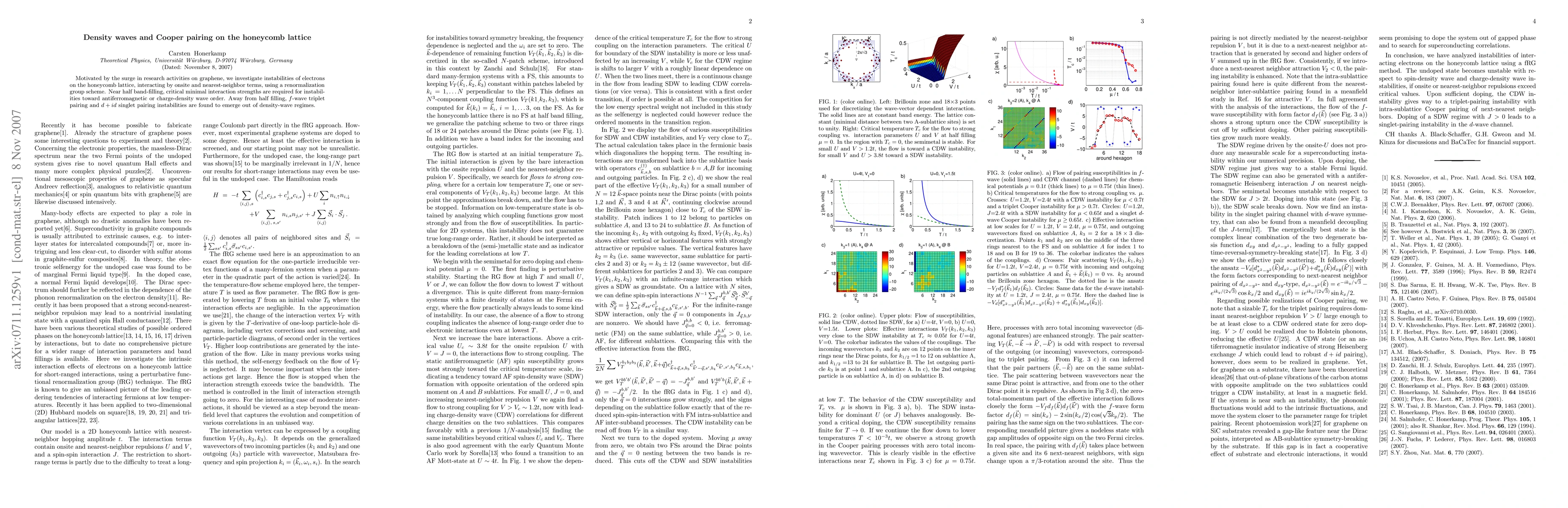 This paper explores electron instabilities on the honeycomb lattice, revealing critical interaction strengths for antiferromagnetic or charge-density wave formation near half-band filling, and identifying f-wave triplet and d+id singlet pairing instabilities away from half-filling.