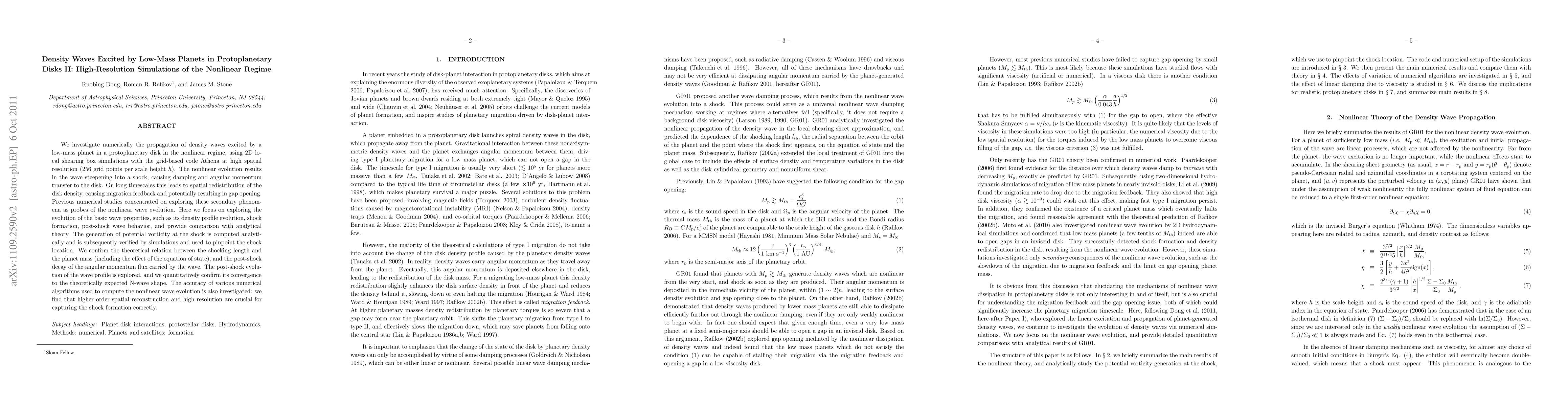 This paper uses high-resolution 2D simulations to study density waves generated by low-mass planets in protoplanetary disks, focusing on the nonlinear regime. The simulations reveal shock formation, angular momentum transfer, and the resulting disk density redistribution, confirming theoretical predictions and highlighting the importance of high-resolution methods for accurate shock capture.