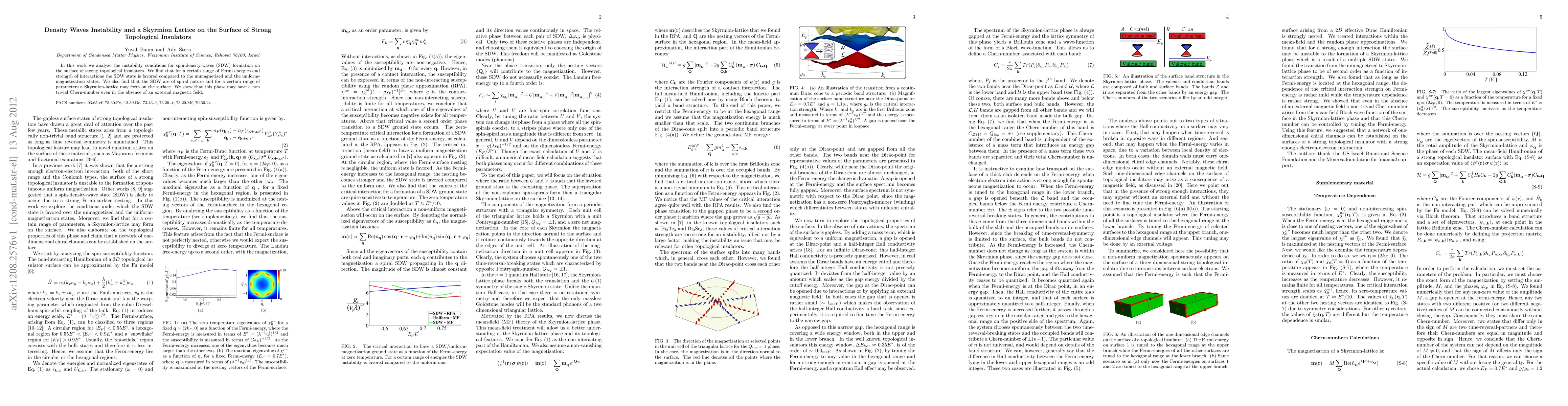 This paper investigates the conditions for spin-density-wave formation on strong topological insulators, revealing a preference for SDW states under specific Fermi-energy and interaction conditions. It also discovers that a Skyrmion lattice can form in a spiral SDW state, which may possess a non-trivial Chern number without an external magnetic field.