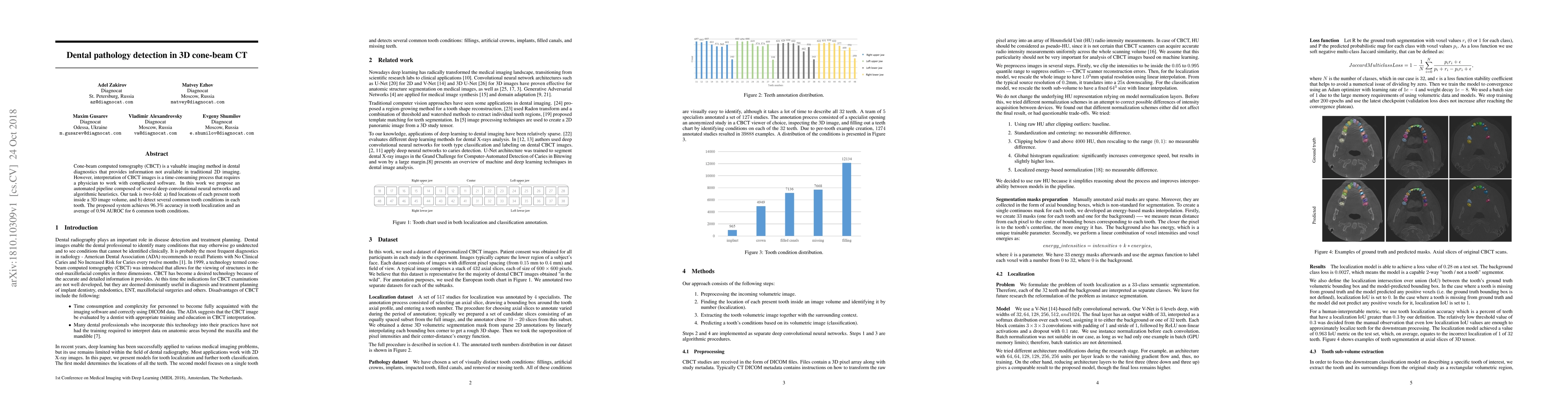 This research proposes an automated pipeline using deep convolutional neural networks to detect dental pathology in 3D cone-beam CT scans, achieving 96.3% accuracy in tooth localization and an average AUROC of 0.94 for detecting common tooth conditions. The aim is to streamline the time-consuming interpretation process in dental diagnostics.