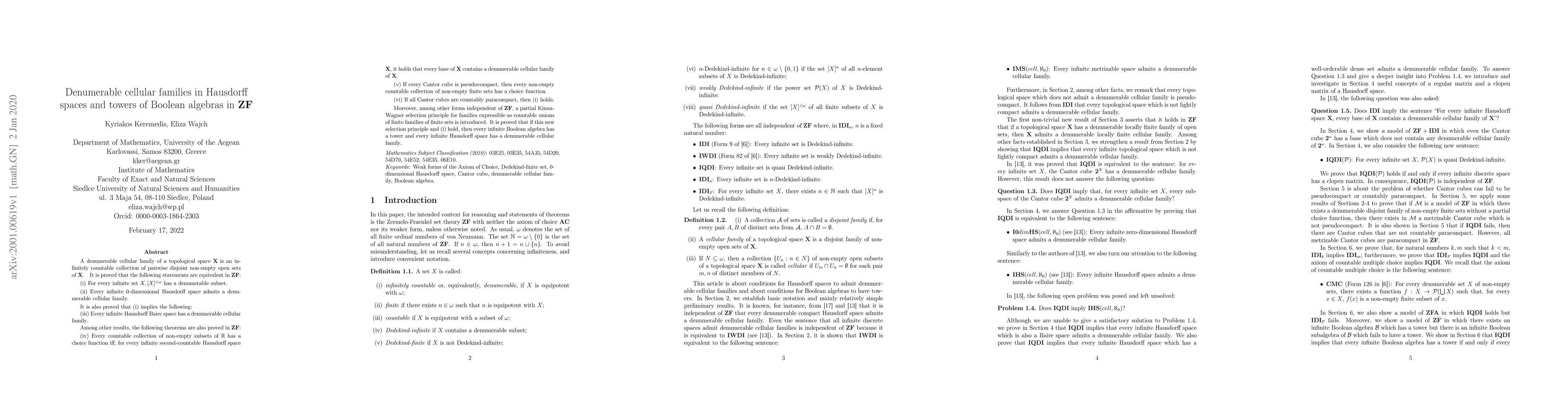 A denumerable cellular family of a topological space $\mathbf{X}$ is an infinitely countable collection of pairwise disjoint non-empty open sets of $ \mathbf{X}$. It is proved that the following statements are equivalent in $\mathbf{ZF}$: (i) For every infinite set $X,[X]^{<\omega }\mathbf{\ }$has a denumerable subset. (ii) Every infinite $0$-dimensional Hausdorff space admits a denumerable cellular family. It is also proved that (i) implies the following: (iii) Every infinite Hausdorff Baire space has a denumerable cellular family. Among other results, the following theorems are also proved in $\mathbf{ZF}$: (iv) Every countable collection of non-empty subsets of $\mathbb{R}$ has a choice function iff, for every infinite second-countable Hausdorff space $ \mathbf{X}$, it holds that every base of $\mathbf{X}$ contains a denumerable cellular family of $\mathbf{X}$. (v) If every Cantor cube is pseudocompact, then every non-empty countable collection of non-empty finite sets has a choice function. (vi) If all Cantor cubes are countably paracompact, then (i) holds. Moreover, among other forms independent of $\mathbf{ZF}$, a partial Kinna-Wagner selection principle for families expressible as countable unions of finite families of finite sets is introduced. It is proved that if this new selection principle and (i) hold, then every infinite Boolean algebra has a tower and every infinite Hausdorff space has a denumerable cellular family.