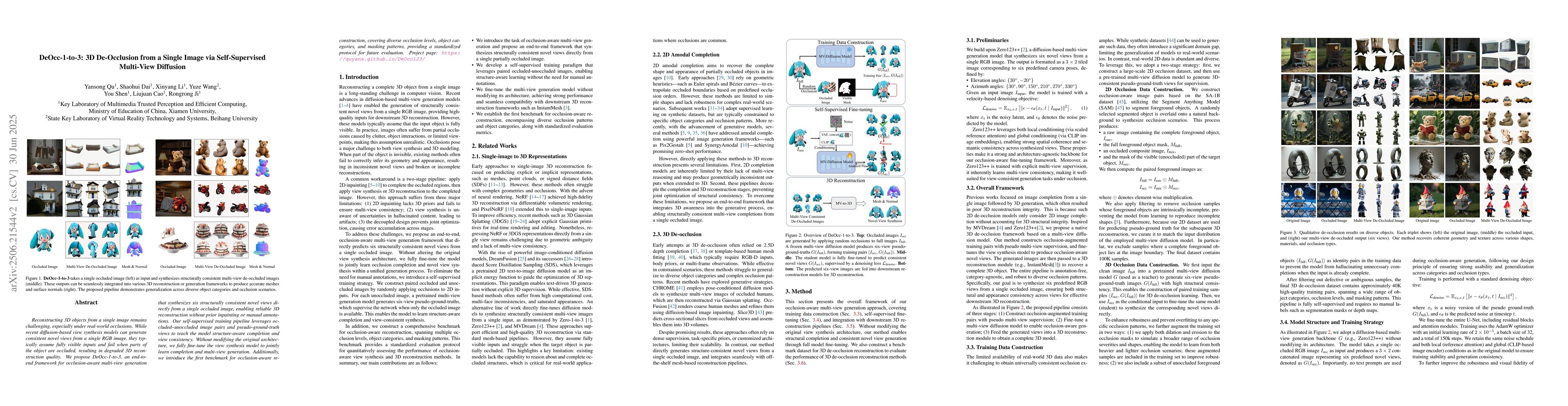 Reconstructing 3D objects from a single image is a long-standing challenge, especially under real-world occlusions. While recent diffusion-based view synthesis models can generate consistent novel views from a single RGB image, they generally assume fully visible inputs and fail when parts of the object are occluded. This leads to inconsistent views and degraded 3D reconstruction quality. To overcome this limitation, we propose an end-to-end framework for occlusion-aware multi-view generation. Our method directly synthesizes six structurally consistent novel views from a single partially occluded image, enabling downstream 3D reconstruction without requiring prior inpainting or manual annotations. We construct a self-supervised training pipeline using the Pix2Gestalt dataset, leveraging occluded-unoccluded image pairs and pseudo-ground-truth views to teach the model structure-aware completion and view consistency. Without modifying the original architecture, we fully fine-tune the view synthesis model to jointly learn completion and multi-view generation. Additionally, we introduce the first benchmark for occlusion-aware reconstruction, encompassing diverse occlusion levels, object categories, and mask patterns. This benchmark provides a standardized protocol for evaluating future methods under partial occlusions. Our code is available at https://github.com/Quyans/DeOcc123.