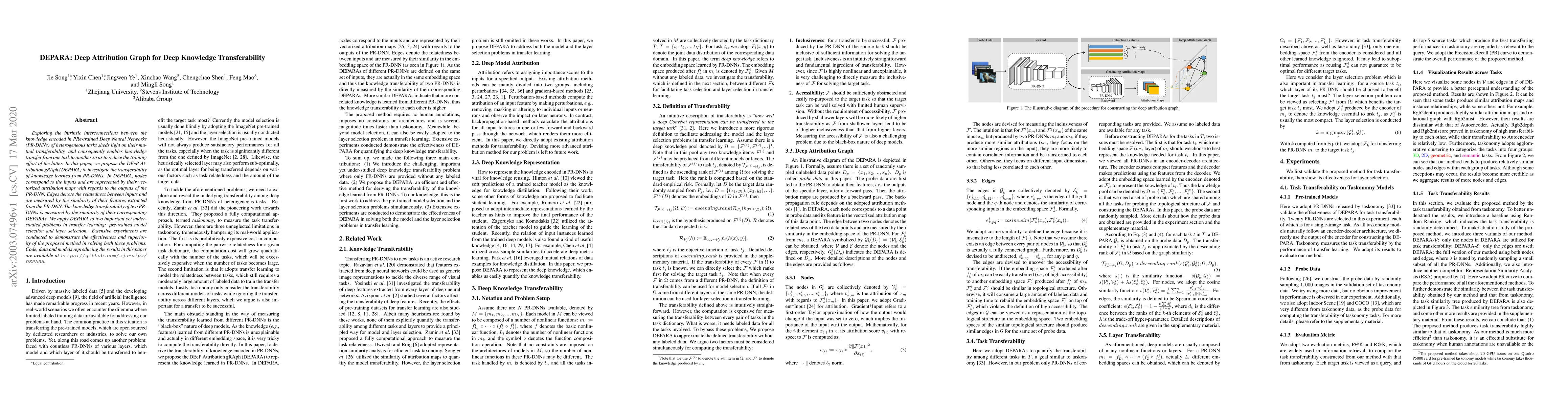 Exploring the intrinsic interconnections between the knowledge encoded in PRe-trained Deep Neural Networks (PR-DNNs) of heterogeneous tasks sheds light on their mutual transferability, and consequently enables knowledge transfer from one task to another so as to reduce the training effort of the latter. In this paper, we propose the DEeP Attribution gRAph (DEPARA) to investigate the transferability of knowledge learned from PR-DNNs. In DEPARA, nodes correspond to the inputs and are represented by their vectorized attribution maps with regards to the outputs of the PR-DNN. Edges denote the relatedness between inputs and are measured by the similarity of their features extracted from the PR-DNN. The knowledge transferability of two PR-DNNs is measured by the similarity of their corresponding DEPARAs. We apply DEPARA to two important yet under-studied problems in transfer learning: pre-trained model selection and layer selection. Extensive experiments are conducted to demonstrate the effectiveness and superiority of the proposed method in solving both these problems. Code, data and models reproducing the results in this paper are available at \url{https://github.com/zju-vipa/DEPARA}.