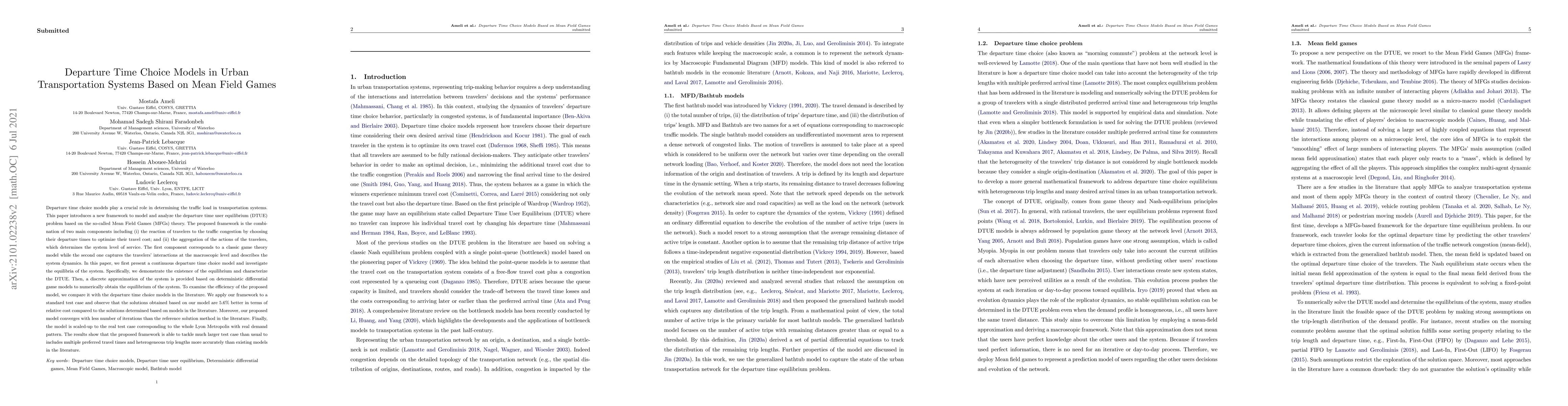Departure time choice models play a crucial role in determining the traffic load in transportation systems. This paper introduces a new framework to model and analyze the departure time user equilibrium (DTUE) problem based on the so-called Mean Field Games (MFGs) theory. The proposed framework is the combination of two main components including (i) the reaction of travelers to the traffic congestion by choosing their departure times to optimize their travel cost; and (ii) the aggregation of the actions of the travelers, which determines the system level of service. In this paper, we first present a continuous departure time choice model and investigate the equilibria of the system. Specifically, we demonstrate the existence of the equilibrium and characterize the DTUE. Then, a discrete approximation of the system is provided based on deterministic differential game models to numerically obtain the equilibrium of the system. To examine the efficiency of the proposed model, we compare it with the departure time choice models in the literature. We apply our framework to a standard test case and observe that the solutions obtained based on our model are 5.6\% better in terms of relative cost compared to the solutions determined based on models in the literature. Moreover, our proposed model converges with less number of iterations than the reference solution method in the literature. Finally, the model is scaled up to the real test case corresponding to the whole Lyon Metropolis with real demand pattern. The results show that the proposed framework is able to tackle much larger test case than usual to includes multiple preferred travel times and heterogeneous trip lengths more accurately than existing models in the literature.