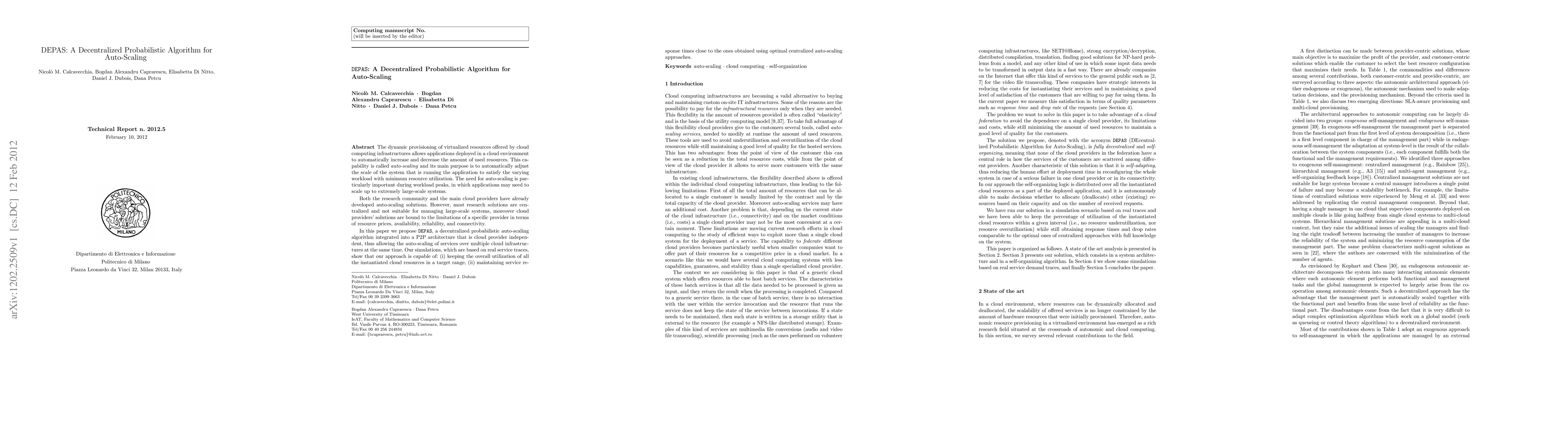 DEPAS is a decentralized probabilistic auto-scaling algorithm designed for cloud environments, enabling efficient resource management across multiple cloud providers. It maintains resource utilization within target ranges and service response times comparable to optimal centralized approaches.