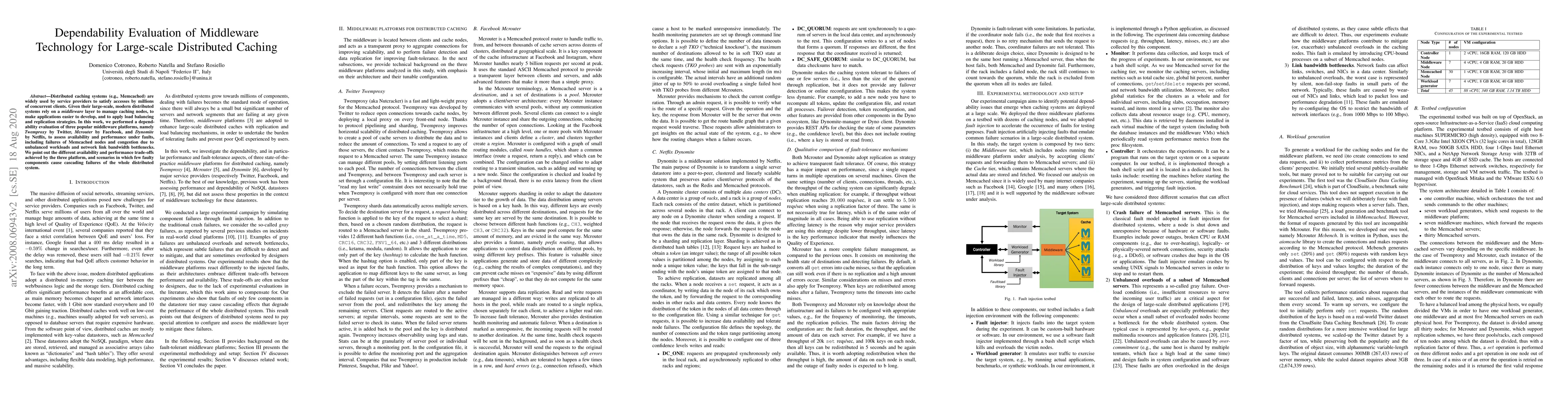 This paper evaluates the dependability of three popular middleware platforms—Twemproxy, Mcrouter, and Dynomite—for large-scale distributed caching systems, assessing their availability and performance under various fault conditions. The study highlights different trade-offs and scenarios where cascading failures occur due to faulty components.