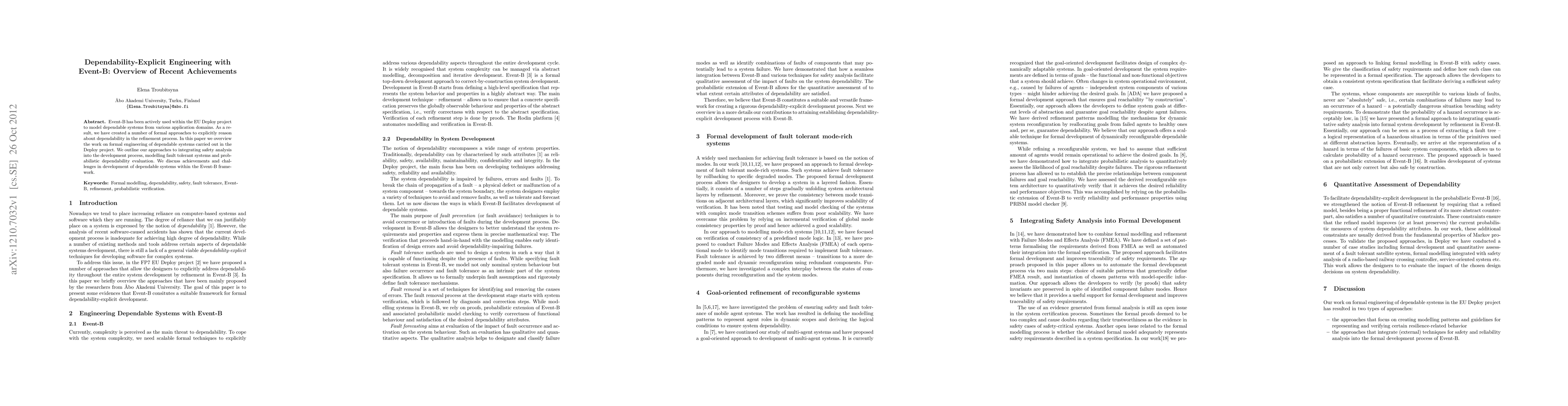 This paper reviews the EU Deploy project's use of Event-B for formal dependability engineering, highlighting achievements in integrating safety analysis, modelling fault-tolerant systems, and probabilistic dependability evaluation, while also discussing ongoing challenges.