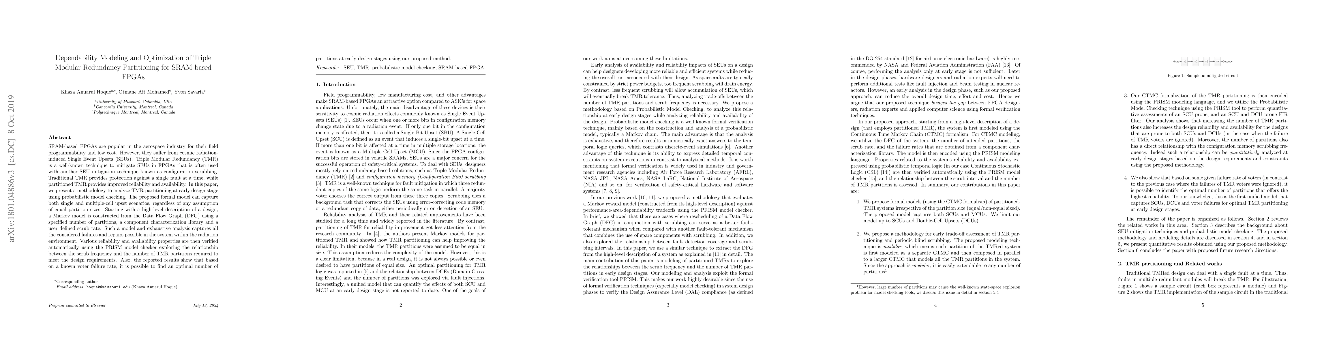 This paper proposes a methodology for dependability modeling and optimization of partitioned Triple Modular Redundancy (TMR) in SRAM-based FPGAs to mitigate cosmic radiation-induced Single Event Upsets (SEUs). Using probabilistic model checking and a Markov model derived from the Data Flow Graph, the authors analyze reliability and availability properties, determining the optimal number of TMR partitions based on scrub frequency and voter failure rate.