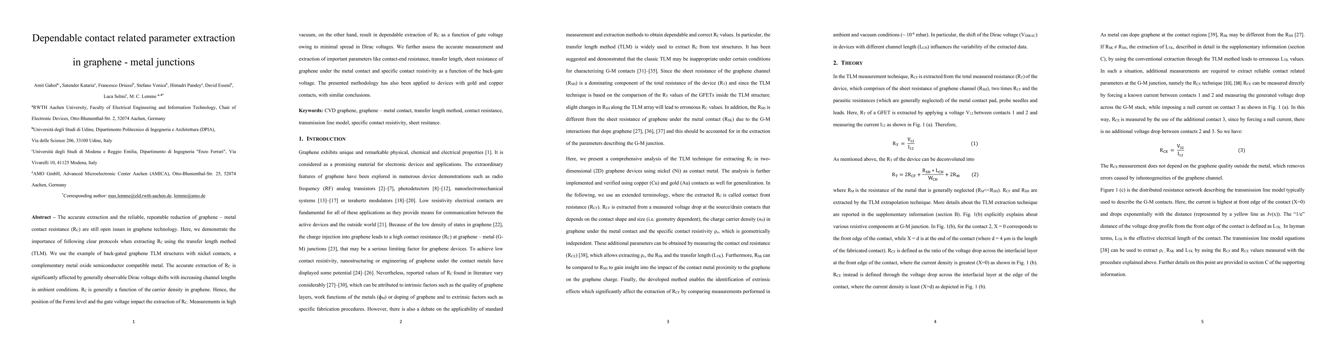 This research highlights the significance of standardized protocols for accurately extracting graphene-metal contact resistance (R_C) using the transfer length method (TLM). It shows that ambient conditions cause Dirac voltage shifts affecting R_C extraction, while high vacuum measurements yield consistent R_C as a function of gate voltage. The methodology also assesses other crucial parameters like contact-end resistance, transfer length, sheet resistance, and specific contact resistivity, applicable to devices with gold and copper contacts.