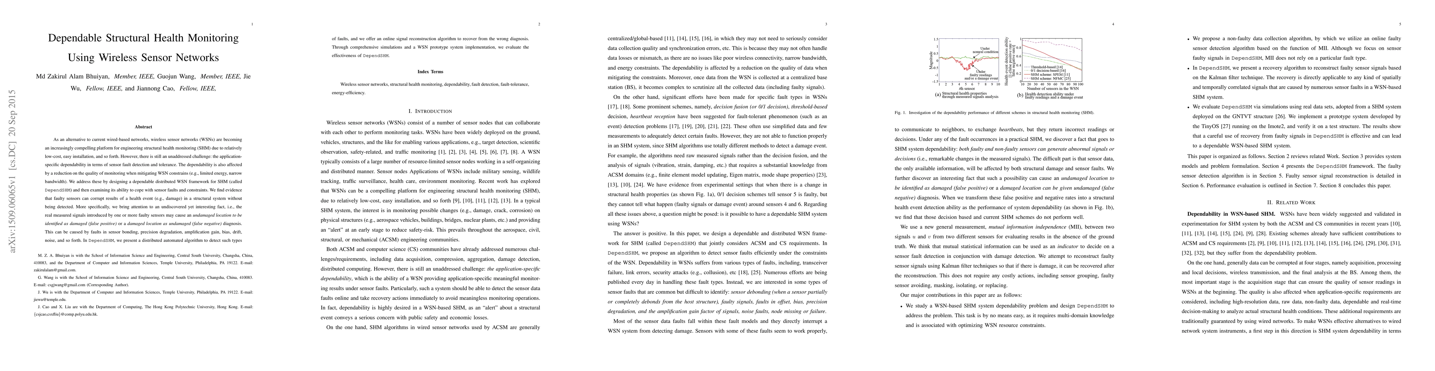 This paper proposes DependSHM, a dependable distributed wireless sensor network framework for structural health monitoring, addressing the challenge of sensor fault detection and tolerance. It introduces an automated algorithm for fault detection and an online signal reconstruction method to mitigate false positives and negatives, and evaluates its effectiveness through simulations and prototype implementation.