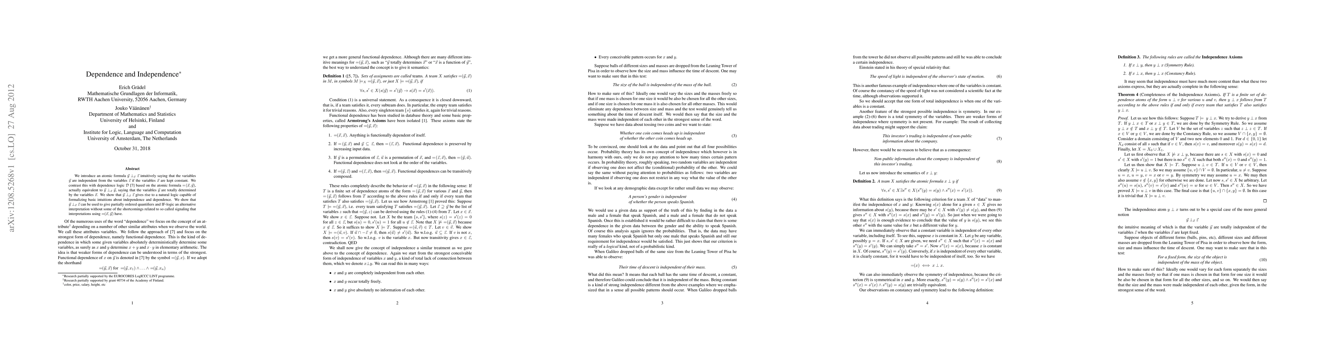 We introduce an atomic formula intuitively saying that given variables are independent from given other variables if a third set of variables is kept constant. We contrast this with dependence logic. We show that our independence atom gives rise to a natural logic capable of formalizing basic intuitions about independence and dependence.