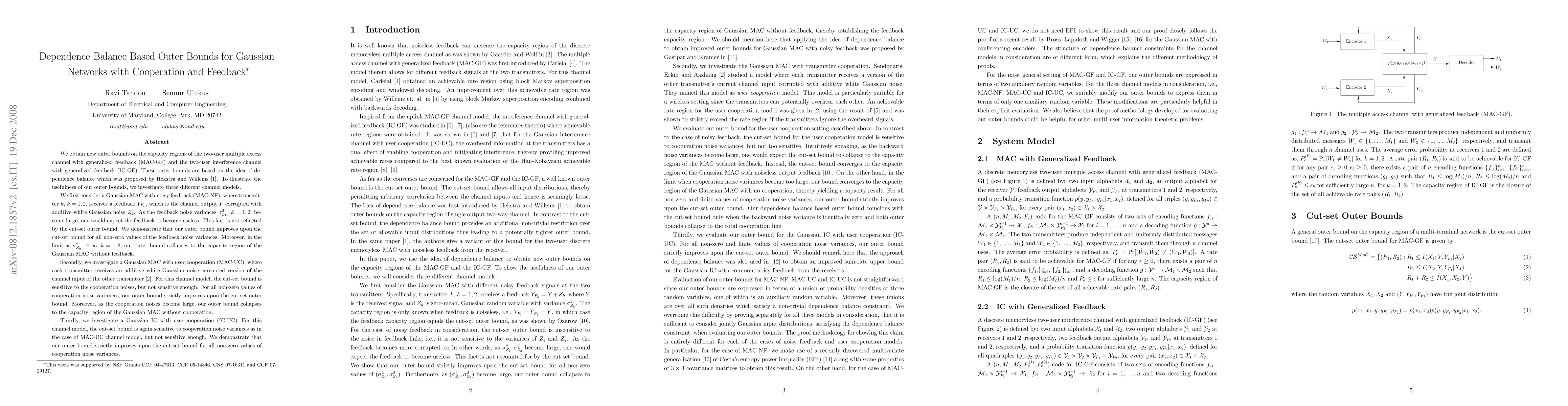 We obtain new outer bounds on the capacity regions of the two-user multiple access channel with generalized feedback (MAC-GF) and the two-user interference channel with generalized feedback (IC-GF). These outer bounds are based on the idea of dependence balance which was proposed by Hekstra and Willems [1]. To illustrate the usefulness of our outer bounds, we investigate three different channel models. We first consider a Gaussian MAC with noisy feedback (MAC-NF), where transmitter $k$, $k=1,2$, receives a feedback $Y_{F_{k}}$, which is the channel output $Y$ corrupted with additive white Gaussian noise $Z_{k}$. As the feedback noise variances become large, one would expect the feedback to become useless, which is not reflected by the cut-set bound. We demonstrate that our outer bound improves upon the cut-set bound for all non-zero values of the feedback noise variances. Moreover, in the limit as $\sigma_{Z_{k}}^{2}\to \infty$, $k=1,2$, our outer bound collapses to the capacity region of the Gaussian MAC without feedback. Secondly, we investigate a Gaussian MAC with user-cooperation (MAC-UC), where each transmitter receives an additive white Gaussian noise corrupted version of the channel input of the other transmitter [2]. For this channel model, the cut-set bound is sensitive to the cooperation noises, but not sensitive enough. For all non-zero values of cooperation noise variances, our outer bound strictly improves upon the cut-set outer bound. Thirdly, we investigate a Gaussian IC with user-cooperation (IC-UC). For this channel model, the cut-set bound is again sensitive to cooperation noise variances but not sensitive enough. We demonstrate that our outer bound strictly improves upon the cut-set bound for all non-zero values of cooperation noise variances.
