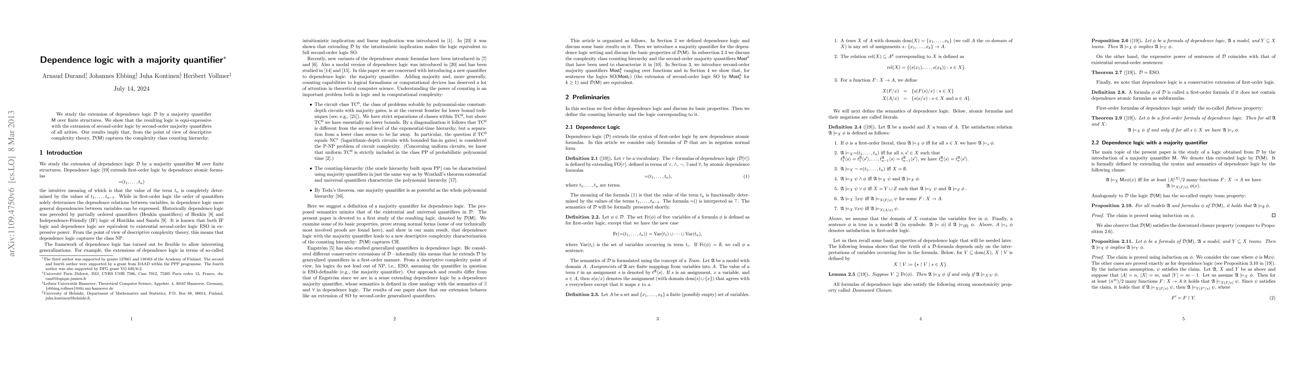 This paper extends dependence logic D with a majority quantifier M, demonstrating that it is equivalent to the extension of second-order logic with majority quantifiers of all arities, highlighting its relevance to the counting hierarchy in descriptive complexity theory.