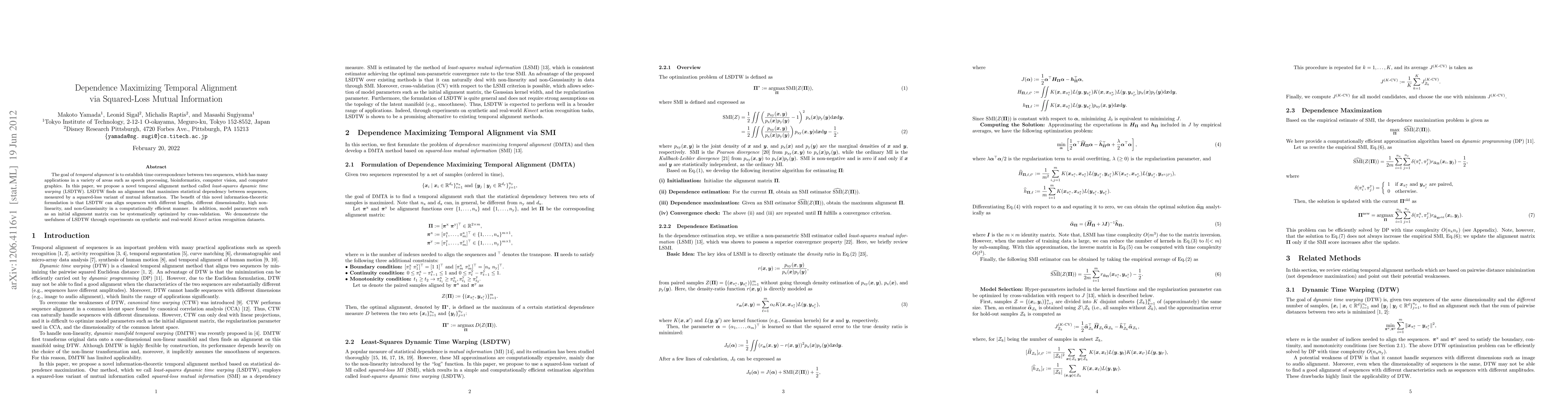This paper introduces a novel temporal alignment method called least-squares dynamic time warping (LSDTW) that maximizes statistical dependency between sequences using a squared-loss variant of mutual information. The method efficiently aligns sequences of different lengths and dimensions, even with high non-linearity and non-Gaussianity, and is demonstrated through experiments on Kinect action recognition datasets.