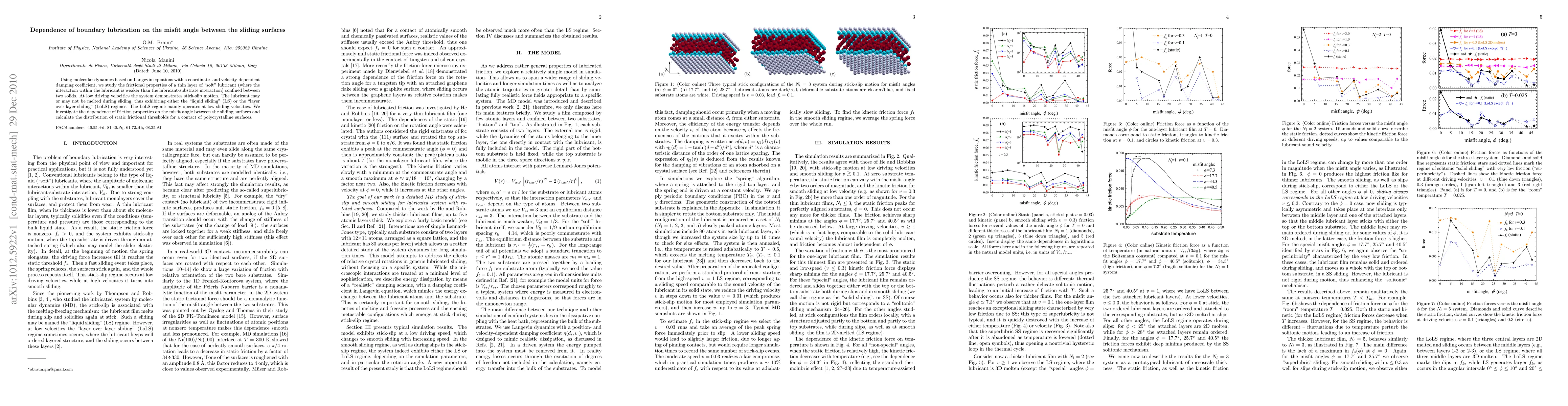 This study uses molecular dynamics to analyze the frictional behavior of a thin layer of soft lubricant between two sliding surfaces, focusing on the dependence of boundary lubrication on the misfit angle. The research identifies stick-slip motion at low velocities and explores the "layer over layer sliding" regime, revealing friction properties influenced by the misfit angle between the surfaces.
