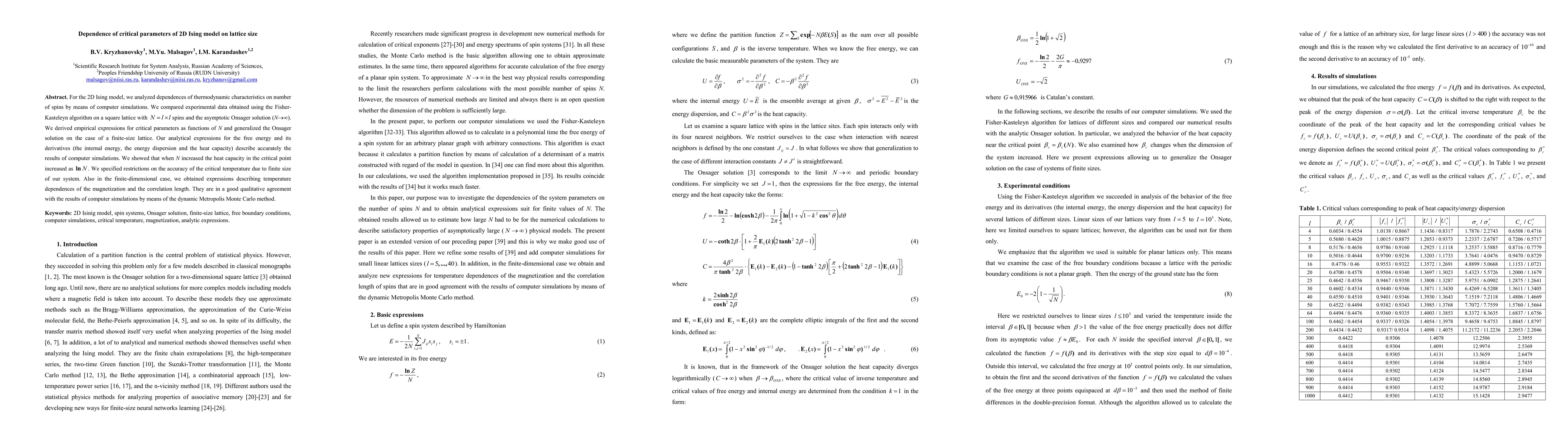 For the 2D Ising model, we analyzed dependences of thermodynamic characteristics on number of spins by means of computer simulations. We compared experimental data obtained using the Fisher-Kasteleyn algorithm on a square lattice with $N=l{\times}l$ spins and the asymptotic Onsager solution ($N\to\infty$). We derived empirical expressions for critical parameters as functions of $N$ and generalized the Onsager solution on the case of a finite-size lattice. Our analytical expressions for the free energy and its derivatives (the internal energy, the energy dispersion and the heat capacity) describe accurately the results of computer simulations. We showed that when $N$ increased the heat capacity in the critical point increased as $lnN$. We specified restrictions on the accuracy of the critical temperature due to finite size of our system. Also in the finite-dimensional case, we obtained expressions describing temperature dependences of the magnetization and the correlation length. They are in a good qualitative agreement with the results of computer simulations by means of the dynamic Metropolis Monte Carlo method.