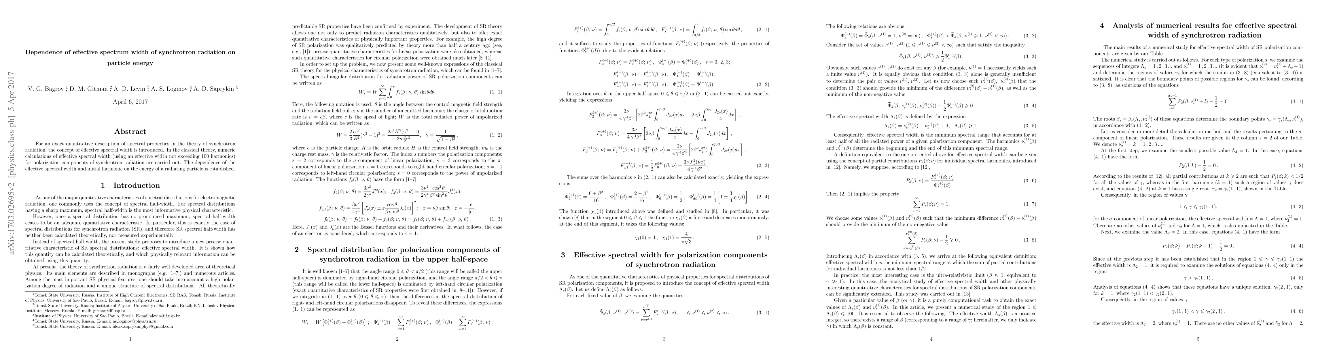 This paper introduces the concept of effective spectral width to quantitatively describe synchrotron radiation's spectral properties. It establishes the dependence of this effective spectral width on the energy of radiating particles, using numerical calculations for polarization components up to 100 harmonics.