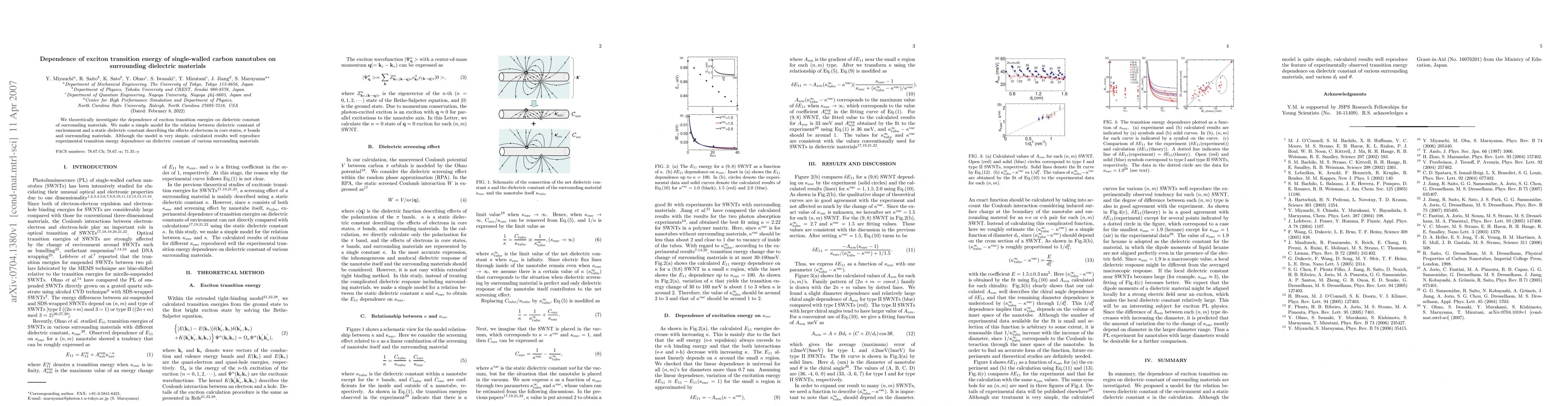 We theoretically investigate the dependence of exciton transition energies on dielectric constant of surrounding materials. We make a simple model for the relation between dielectric constant of environment and a static dielectric constant describing the effects of electrons in core states, $\sigma$ bonds and surrounding materials. Although the model is very simple, calculated results well reproduce experimental transition energy dependence on dielectric constant of various surrounding materials.