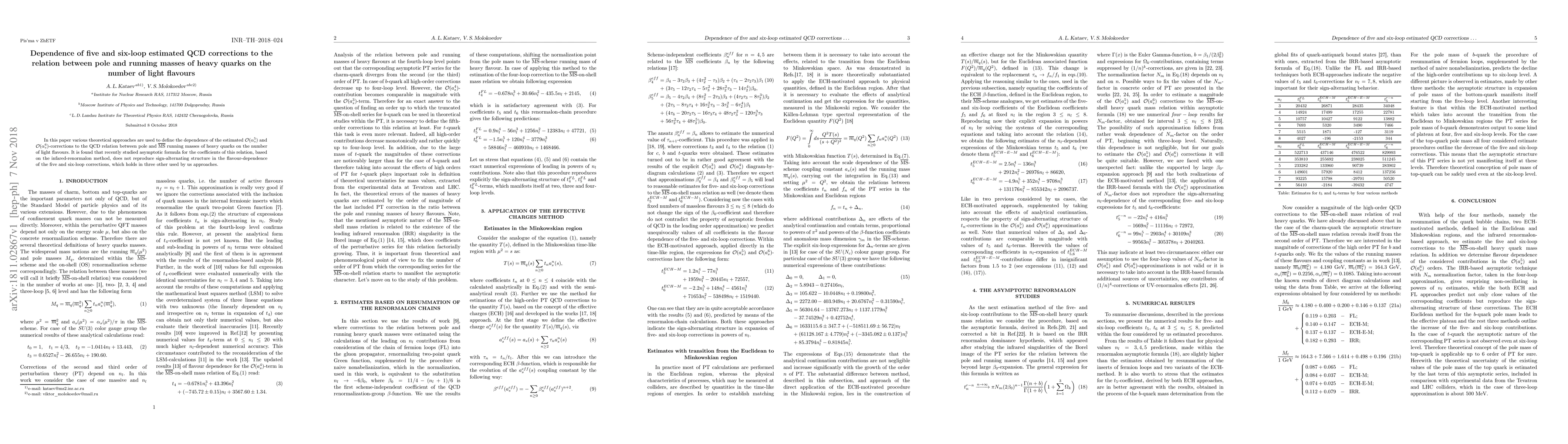 This paper investigates the dependence of five and six-loop QCD corrections on the number of light flavours in the relation between pole and running masses of heavy quarks. It finds that the asymptotic formula based on the infrared-renormalon method fails to capture the sign-alternating structure observed in other theoretical approaches.