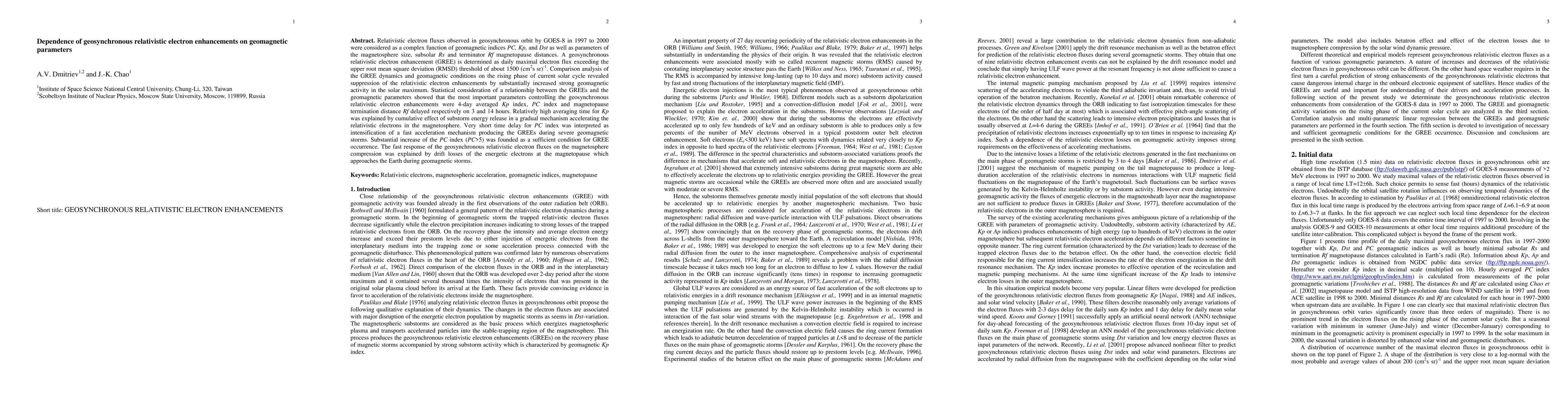 Research found that geomagnetic activity affects relativistic electron enhancements in geosynchronous orbit, with severe storms causing significant increases in electron fluxes. The most important parameters controlling these enhancements were the 4-day averaged Kp index, PC index, and magnetopause termination distance.